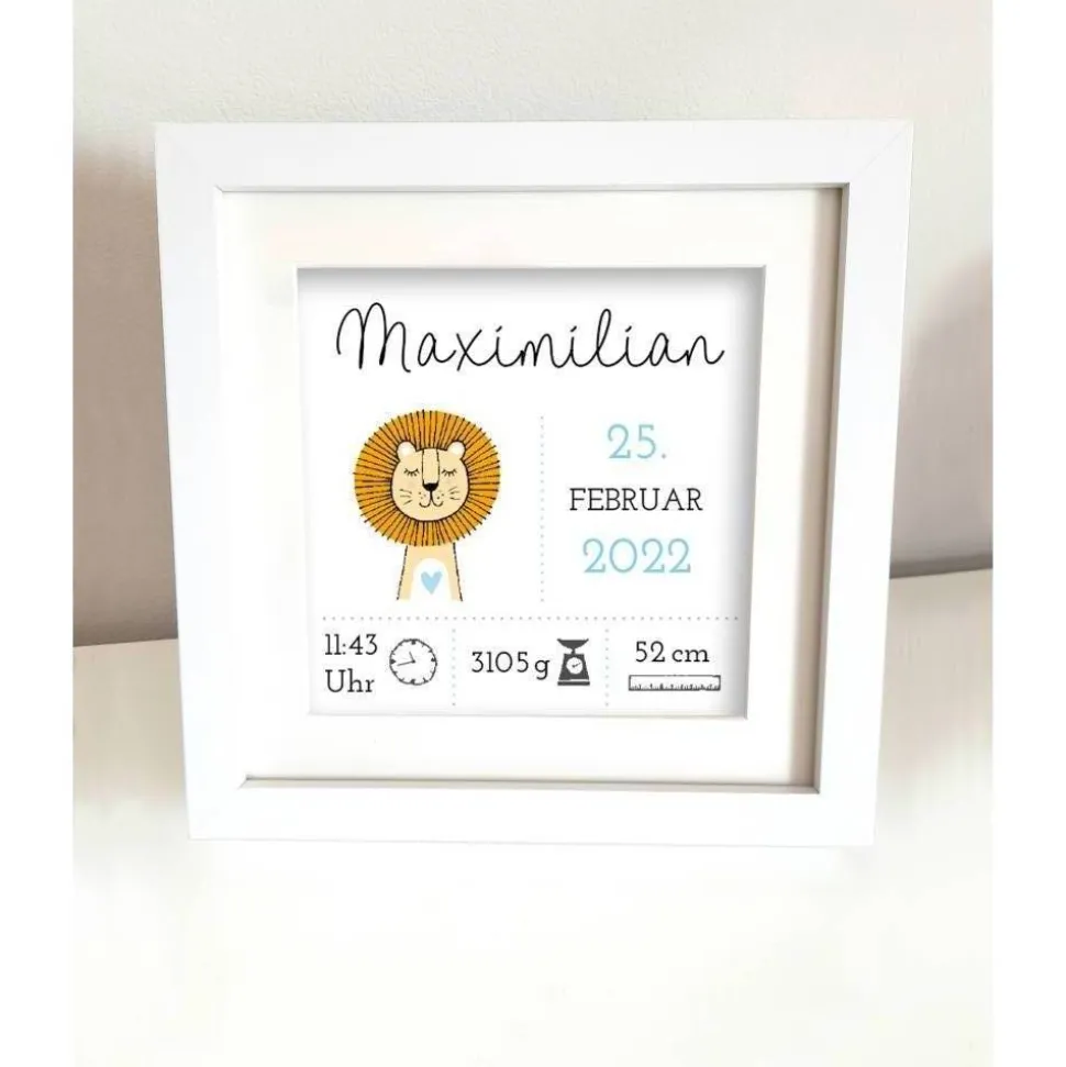 Teilt mir bitte beim Kauf die Daten wie Name, Datum, Uhrzeit, Gewicht, Größe und die Farbe blau oder grün mit. Je nach Namen, kann die Anordnung der Motive etwas vom Musterbild abweichen. Der Bilderrahmen in der Farbe weiß gehört natürlich dazu.
