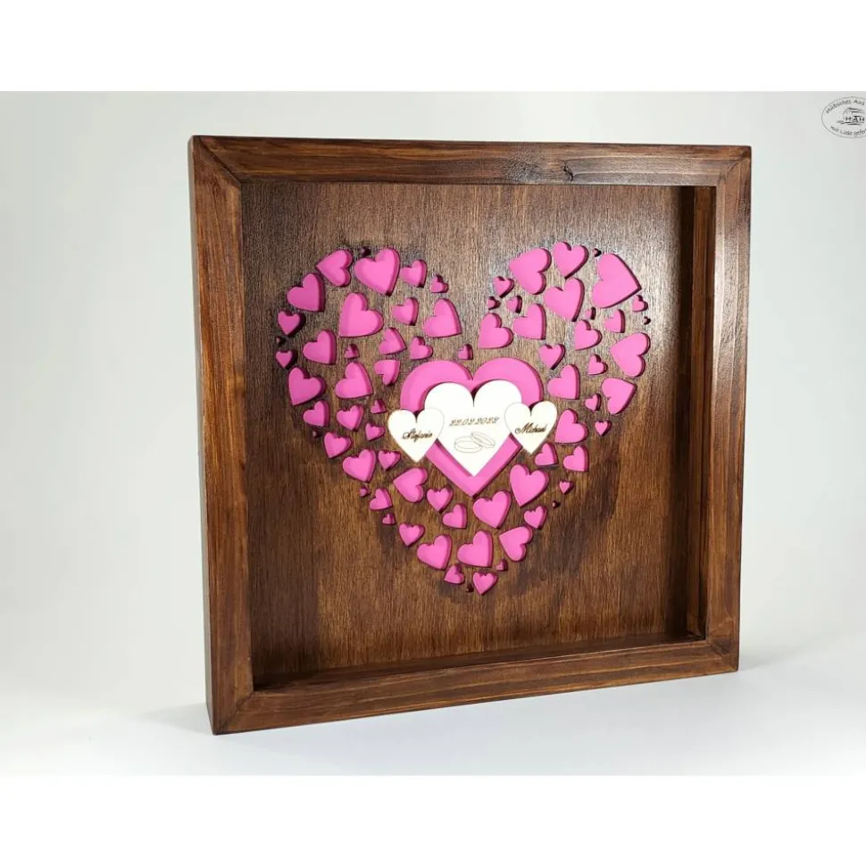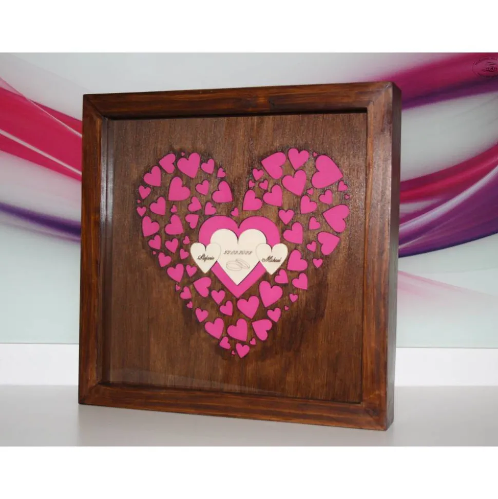 Das Inlay wurde aus Pappelholz gefertigt und wird mit den Namen des Brautpaares und des Hochzeitsdatums graviert.
