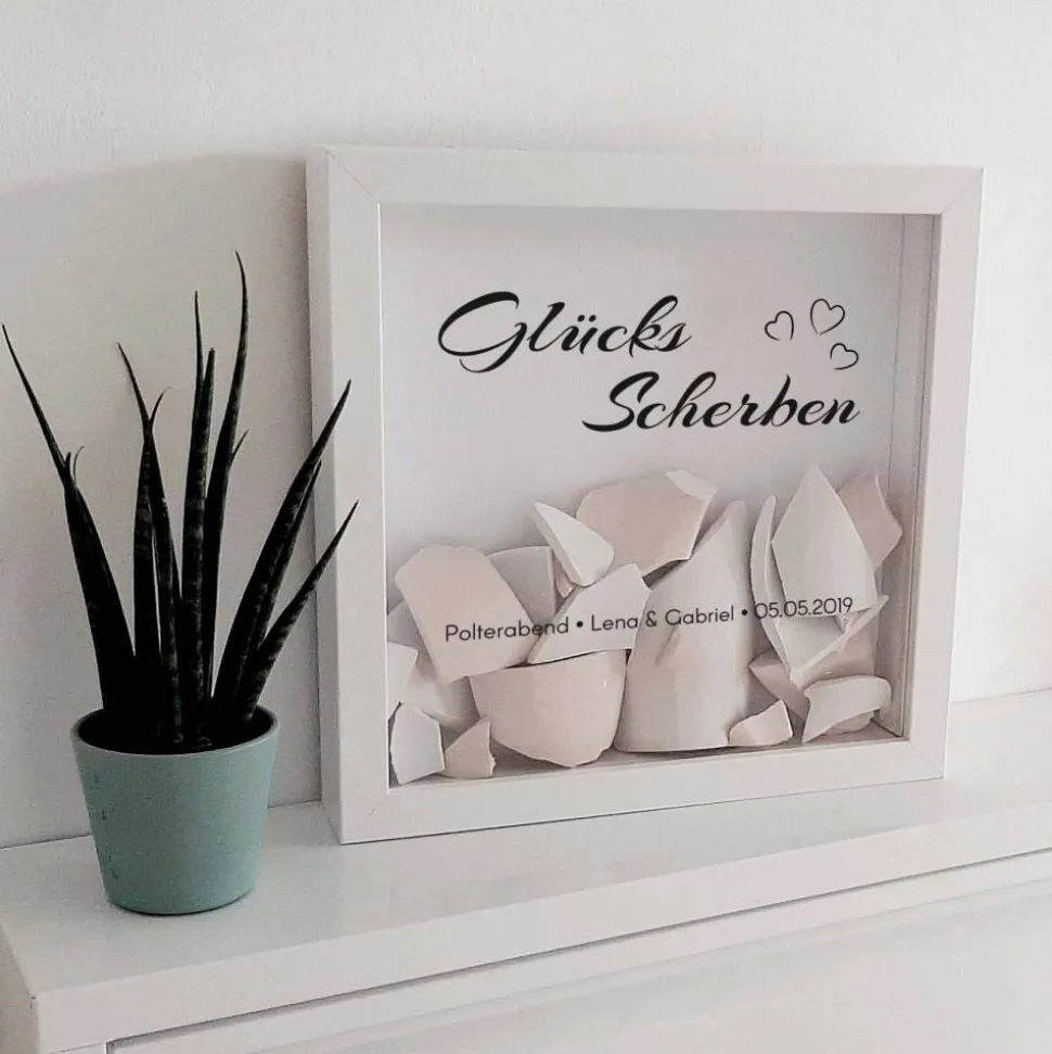 Lieferumfang: Du erhältst 1x weißen Bilderrahmen mit personalisiertem Schriftzug & Motiv nach Vorlage – ohne Deko/Scherben. Perfekt, um deine eigenen Polterabend-Scherben stilvoll zu präsentieren alternativ nur den Aufkleber ohne Bilderrahmen!.