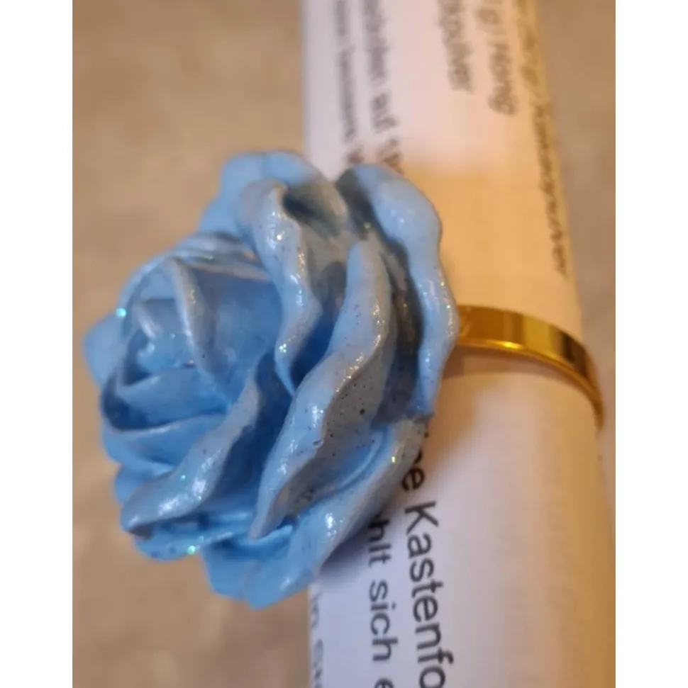 Die Rose wurde aus eingefärbtem Raysin 200 gegossen und nach dem Trocknen mit Glitzerlack veredelt. Der goldfarbene Ring ist direkt mit eingegossen und sorgt für eine besonders stabile Verbindung mit der Rose. Die Kombination aus edlem Blau, funkelndem Glitzer und dem goldenen Ring macht dieses Accessoire zu einem besonderen Highlight.