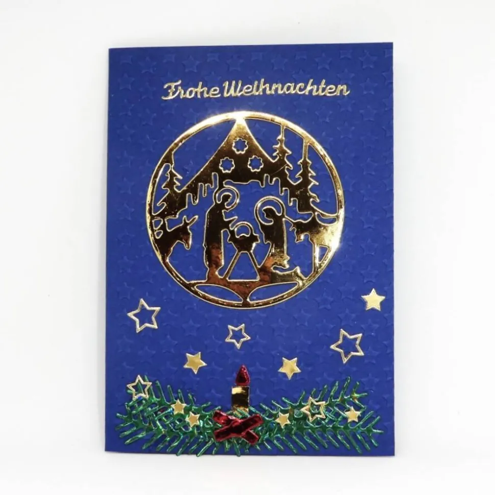 Diese liebevoll gefertigte Weihnachtskarte in edlem Blau ist ein echtes Unikat und zieht garantiert alle Blicke auf sich. Die Vorderseite ist mit kleinen, geprägten Sternen, einer gestanzten goldfarbenen Weihnachtskrippe in runder Form wie eine Christbaumkugel, gestanzten Tannenzweigen sowie einer kleinen roten Kerze und Schleife dekoriert. Zusätzlich schmücken kleine goldfarbene Sterne die Karte. Die Aufschrift „Frohe Weihnachten“ erstrahlt in goldener Farbe.