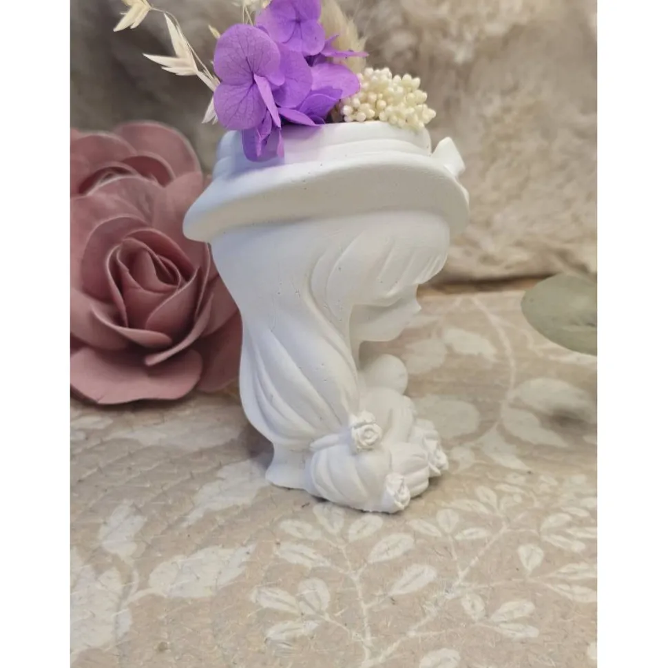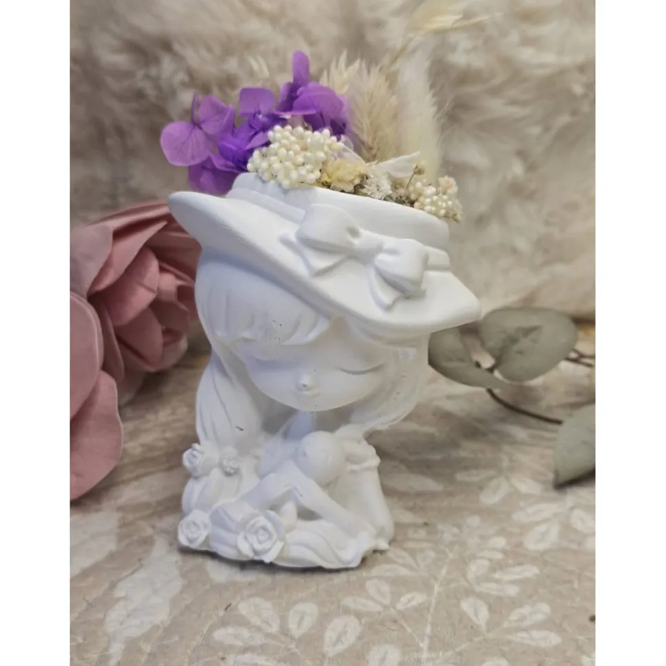 Das Blumenmädchen trägt einen kleinen Hut mit feiner Schleife und hält schützend ihr Stofftier – ein süßer Hase, der für Geborgenheit und Wärme steht. Im oberen Bereich ist sie mit echten Trockenblumen in zarten Lila- und Naturtönen verziert. Die Kombination aus mattem Weiß und den sanften Blütenfarben verleiht Laila eine besonders harmonische Ausstrahlung.