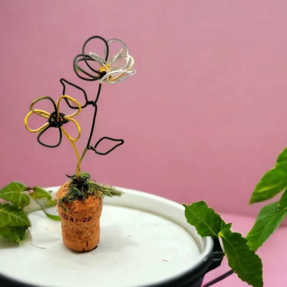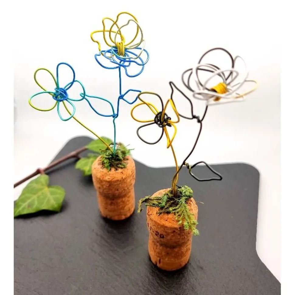 Gesamthöhe ca. 14-15 cm. Die Blumen gibt es in den Faben „Ozean“ und „Mistral“, der Draht hat einen schönen Farbverlauf, wodurch jedes Teil einzigartig ist..