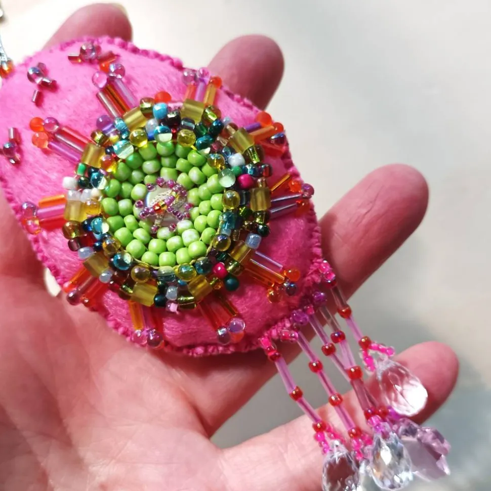 Entdecke das einzigartige Boho Deko Ornament – ein handgemachtes Unikat, das pure Lebensfreude und Luxus in deine Wohnräume bringt! Jedes Ornament ist liebevoll von Hand gefertigt und mit einer aufwändigen Perlenstickerei veredelt. Funkelnde Glasblüten in pink, orange, grün und weiteren bunten Farben machen dieses Schmuckstück zu einem echten Blickfang.