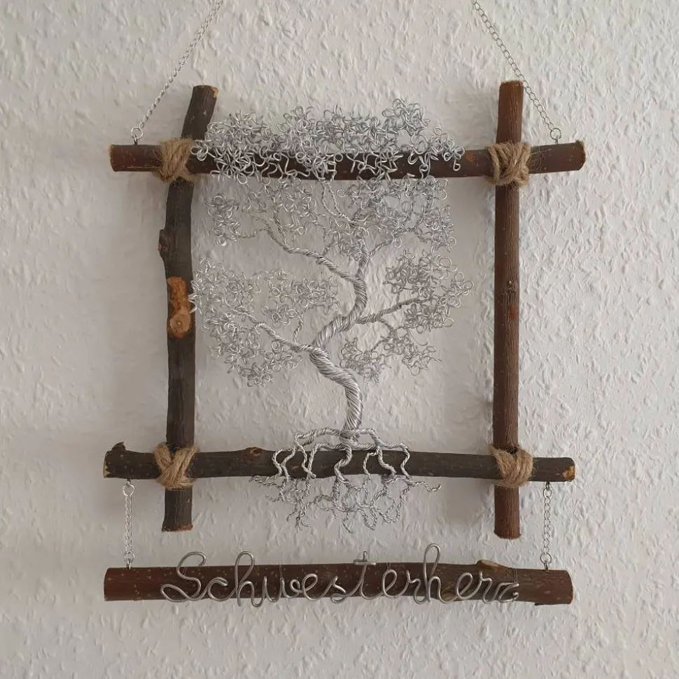 Der Drahtbaum selbst besteht aus Aluminiumdraht, ich verwende für den Baum über 25 Meter Draht. Der Rahmen besteht aus 4 Natur Ästen die durch eine Kordel verknotet werden. Als Aufhängung dient eine Eisenkette die silberfarben plattiert ist, die am oberen Ast befestigt ist. Diese Dient auch als Verbildung zum Ast mit dem Schriftzug. Der Schriftzug wird aus silberfarbenen Aluminiumdraht Handgebogen. Und wird mit sehr dünnen Draht auf dem Ast befestigt.