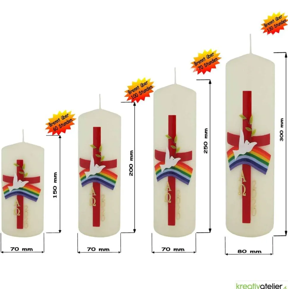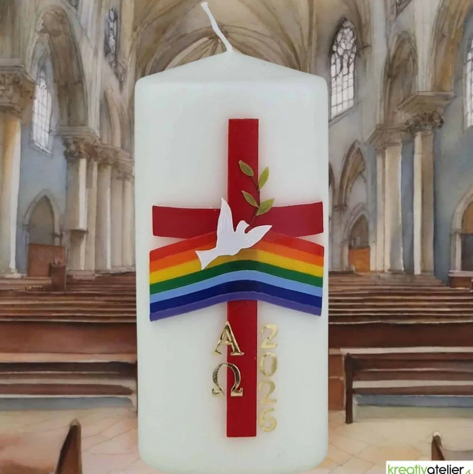 Die Osterkerze mit Taube, Kreuz, Regenbogen, Alpha und Omega ist ein symbolisches Kunstwerk, das den Glauben an die Auferstehung Jesu zum Ausdruck bringt. Die Taube steht für den Heiligen Geist, das Kreuz erinnert an das Leiden und den Tod Jesu und der Regenbogen symbolisiert die Verheißung des Friedens. Alpha und Omega sind die ersten und letzten Buchstaben des griechischen Alphabets und stehen für den Anfang und das Ende, das neue Leben. Diese Kerze ist eine wunderbare Möglichkeit, das Osterfest zu feiern und die Bedeutung dieses wichtigen Ereignisses zu ehren.