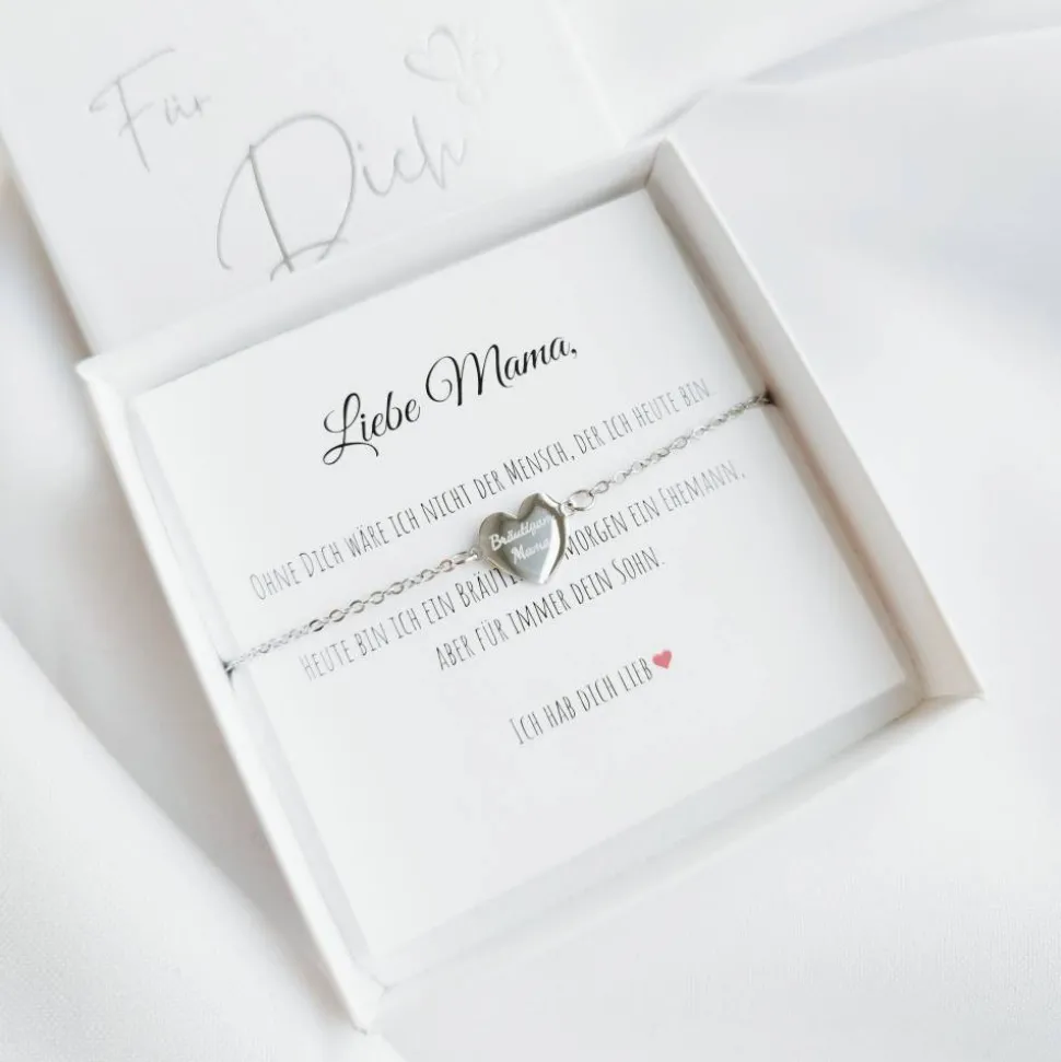 Dieses elegante Armband mit einem gravierten Herz Symbol wird der Brautmama und/oder Bräutigam Mutter ein strahlendes Lächeln auf die Lippen zaubern.