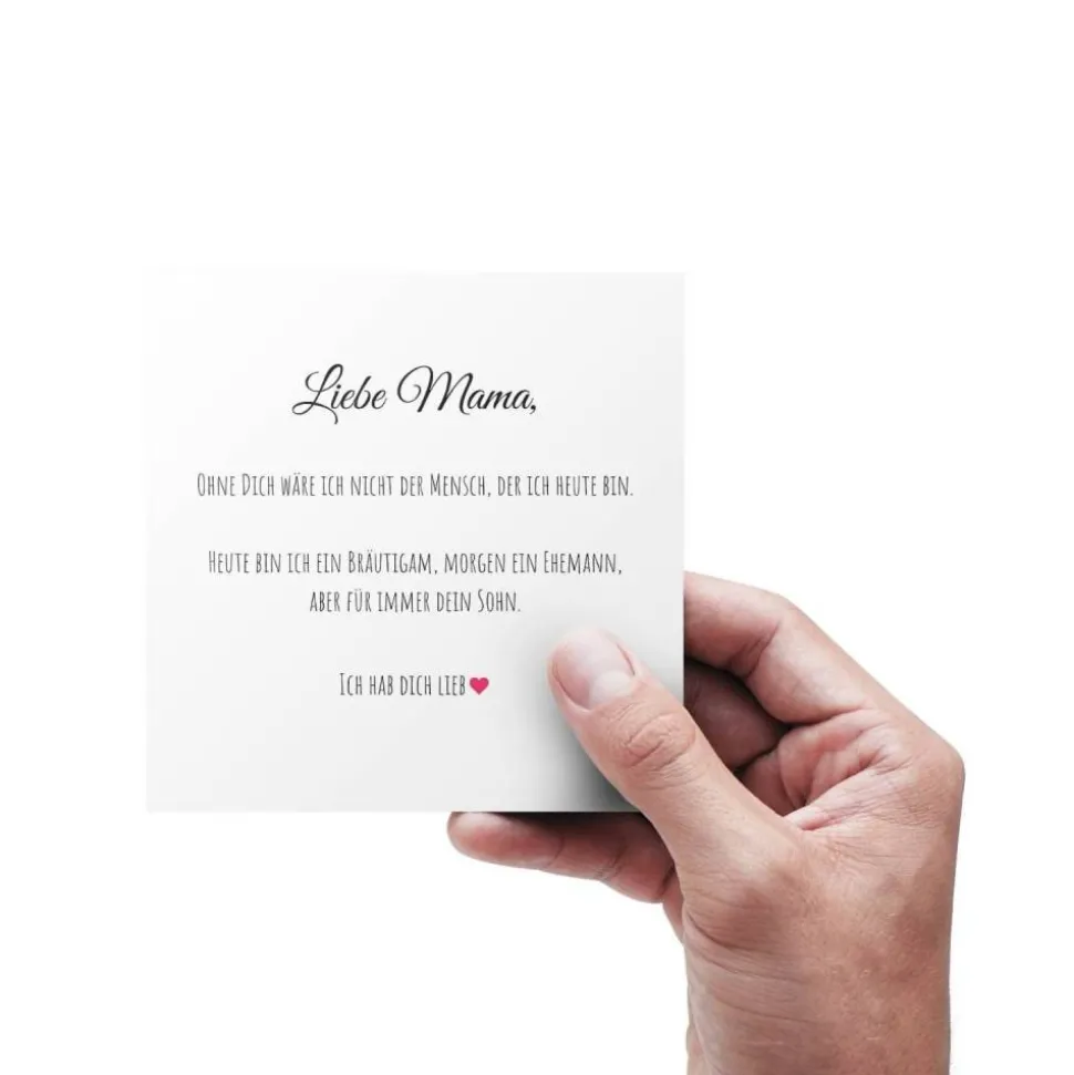 Dein Geschenk kommt hübsch verpackt in einer edlen Geschenkschachtel mit der bedruckten Spruch Karte für die Brautmama oder Bräutigam Mutter zu dir.