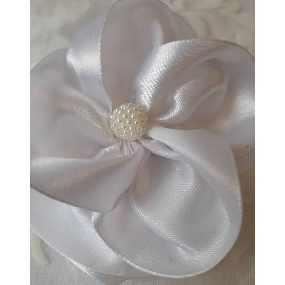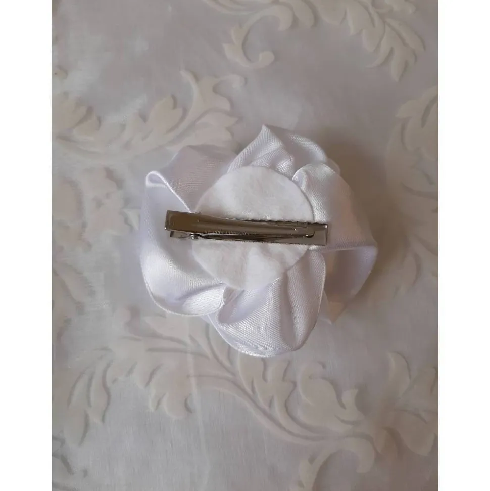 Romantische Haarklammer in Form einer Blüte, individuell gefertigt aus weißem Satin. In der Mitte eine hübsch Kunstperle.