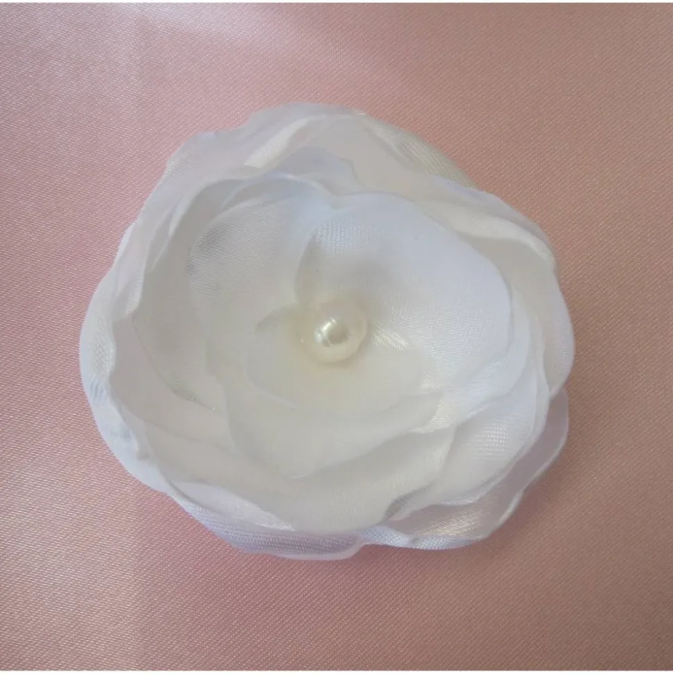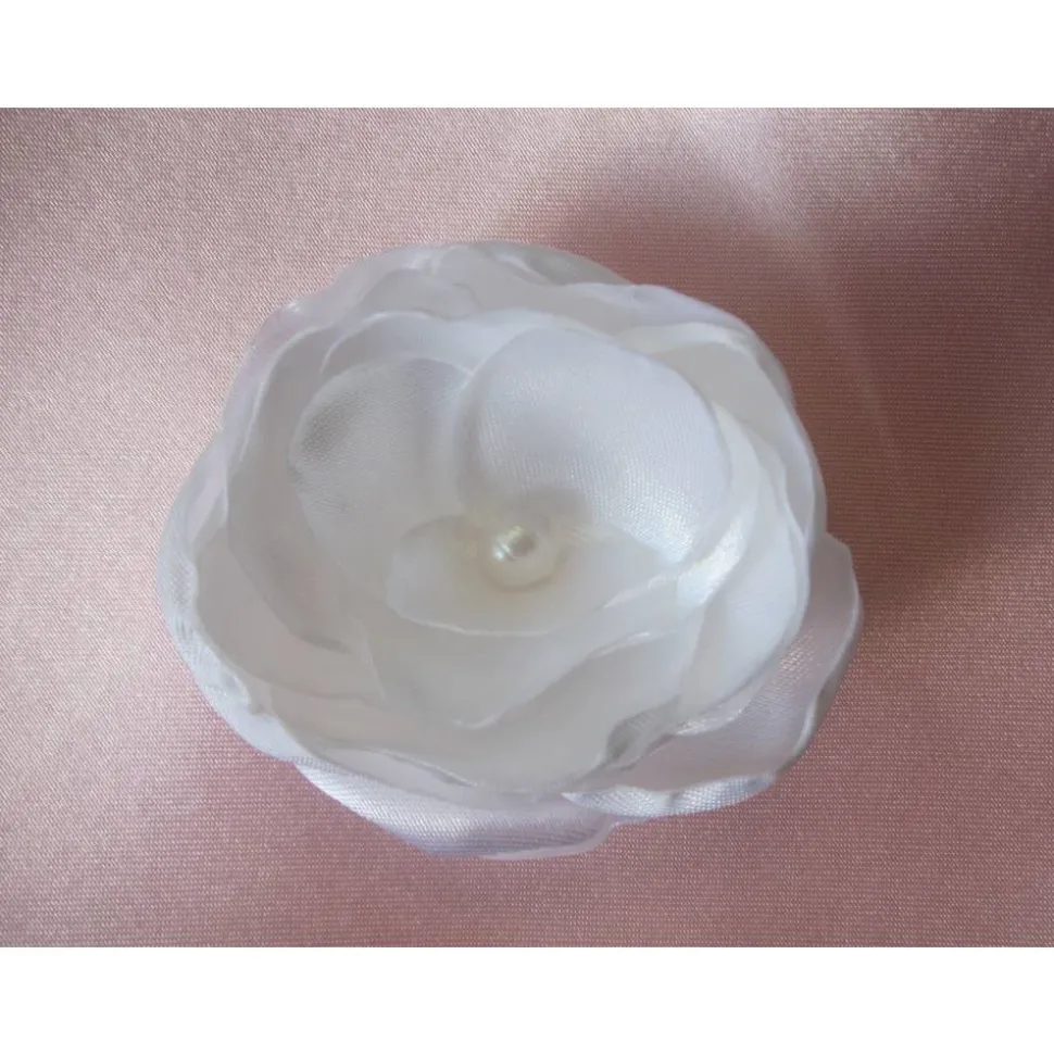 Romantische Haarklammer in Form einer Blüte, individuell gefertigt aus weißem Satin. In der Mitte eine echte Süßwasserperle.