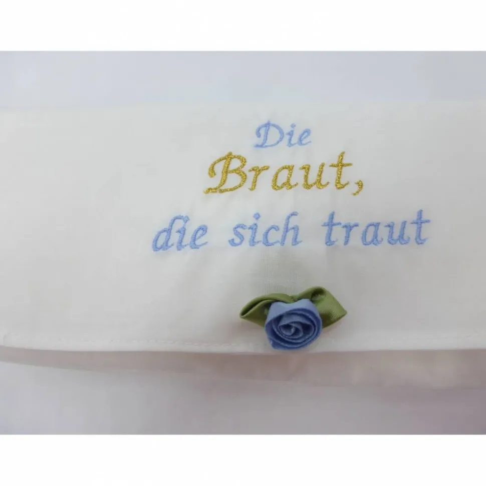 Vorne ist ein kleines, blaues Satinröschen aufgenäht.