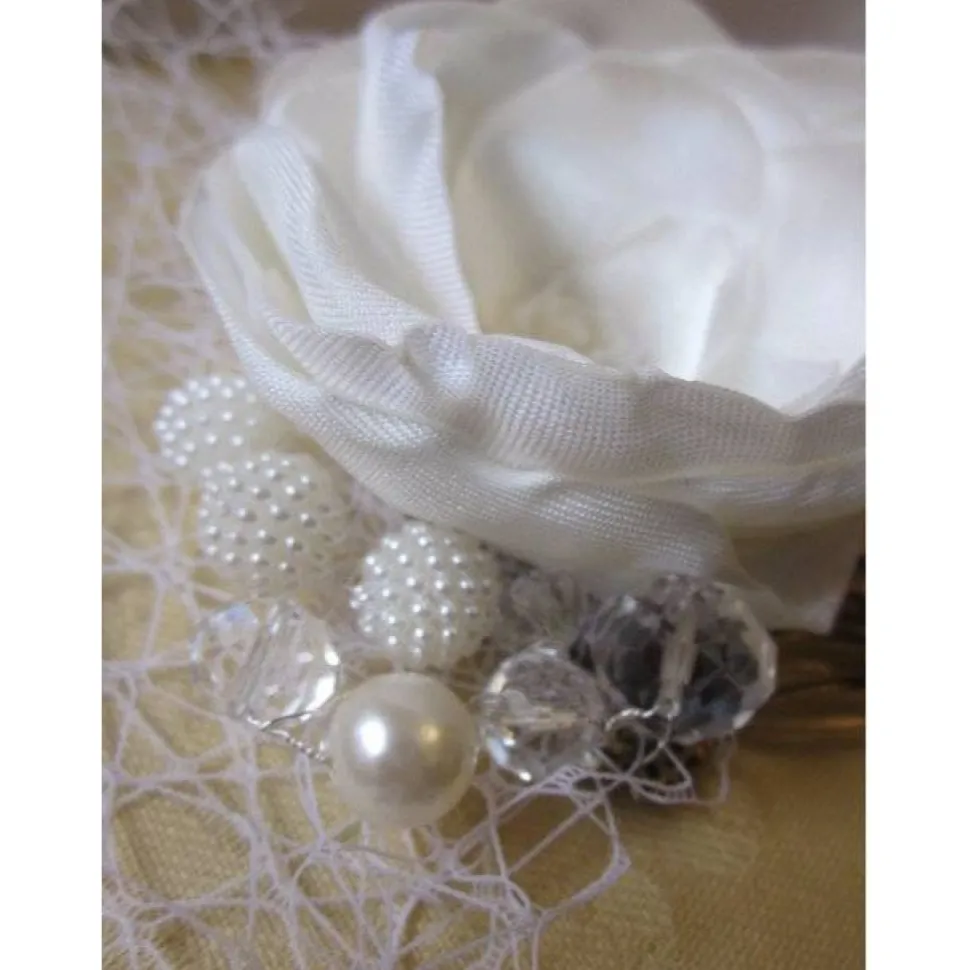 Zauberhafter Haarkamm in Form einer cremeweißen Blüte, individuell handgefertigt aus schimmerndem Satin, Netztüll und 9 Kunstperlen.