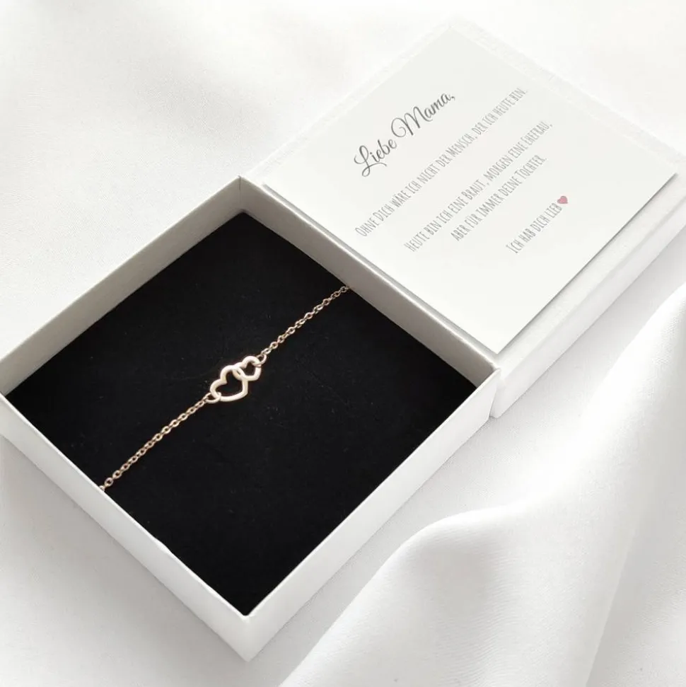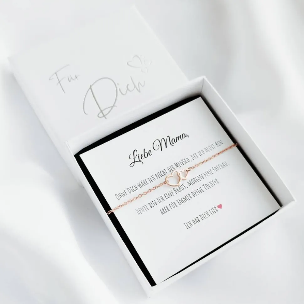 Dein Vorteil: Das Armband kommt liebevoll verpackt in einer edlen Geschenkschachtel mit einer bedruckten Spruchkarte für die Brautmama – bereit zum Verschenken!