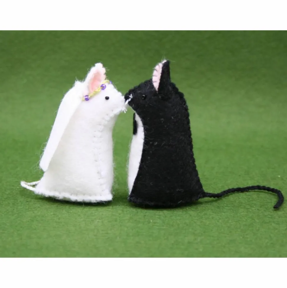 Der Bräutigam hat eine schwarze Fliege aus Filz und die Braut einen Bluemenkranz und einen Schleier bekommen.