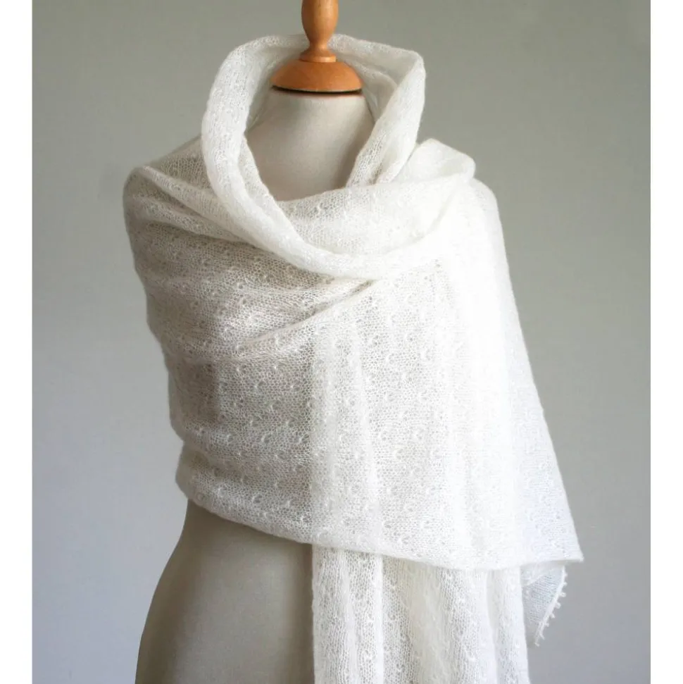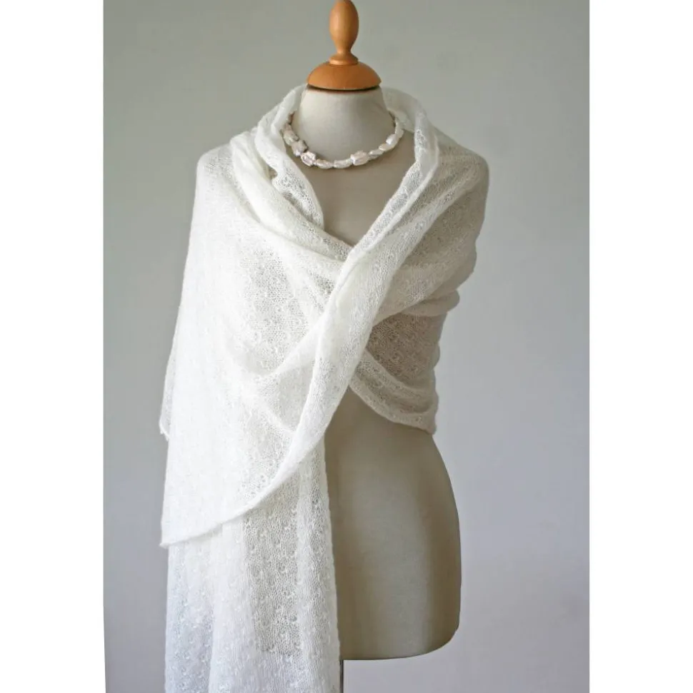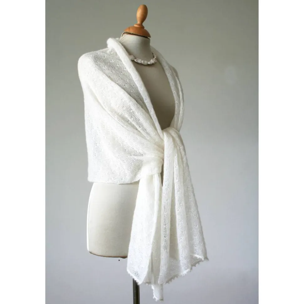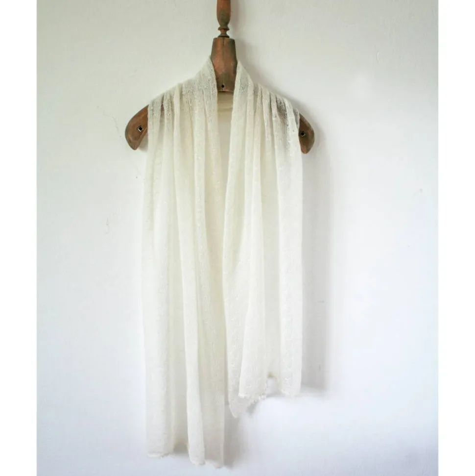 Wunderbar weiche Lace Stola, handgefertigt aus dünnem italienischen Super-Kid-Mohair in Ivory/Elfenbeinweiß. Die Farbe ist ein helles Ivory, fast weiß.