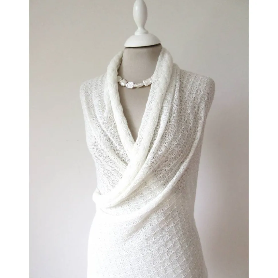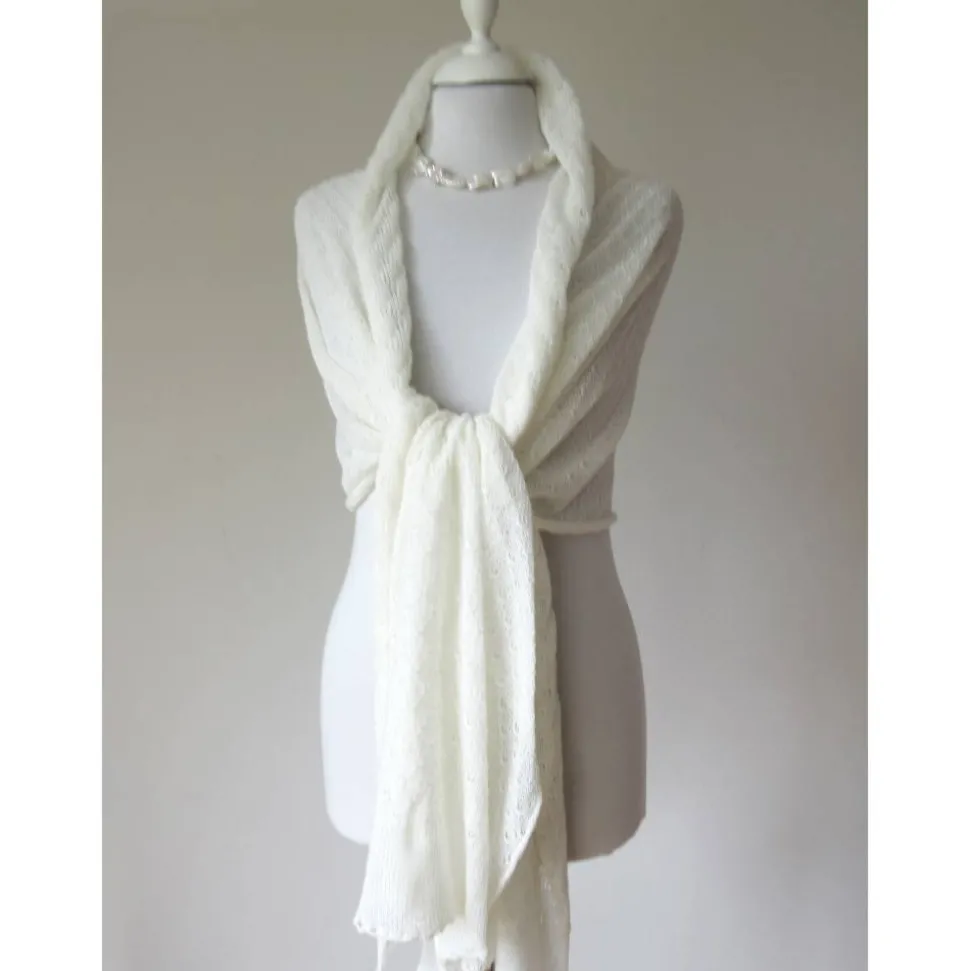 Edle Lace-Stola, gestrickt aus dünnem italienischen Kaschmirgarn in Ivory/Elfenbeinweiß. Die Farbe ist ein helles Ivory, fast weiß.