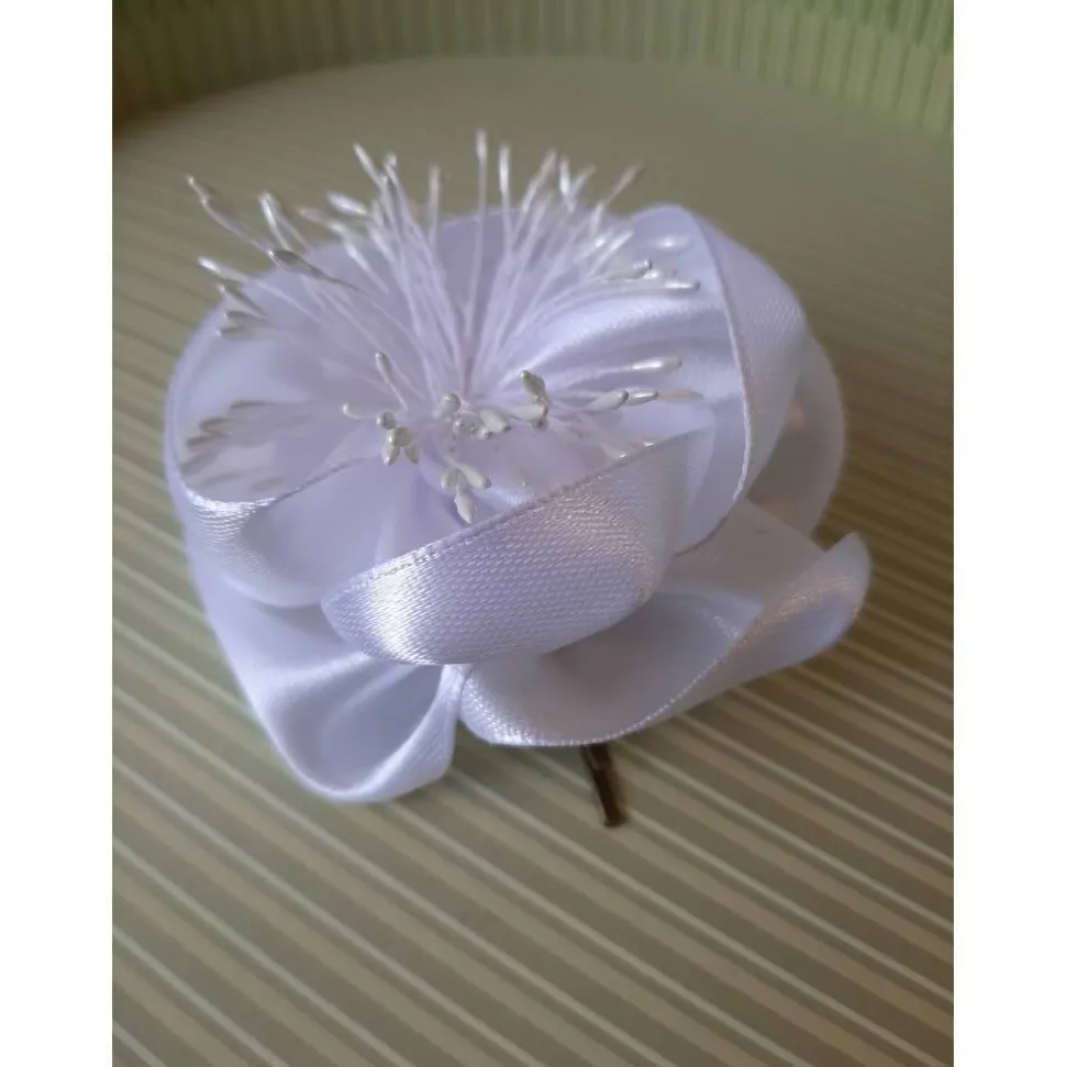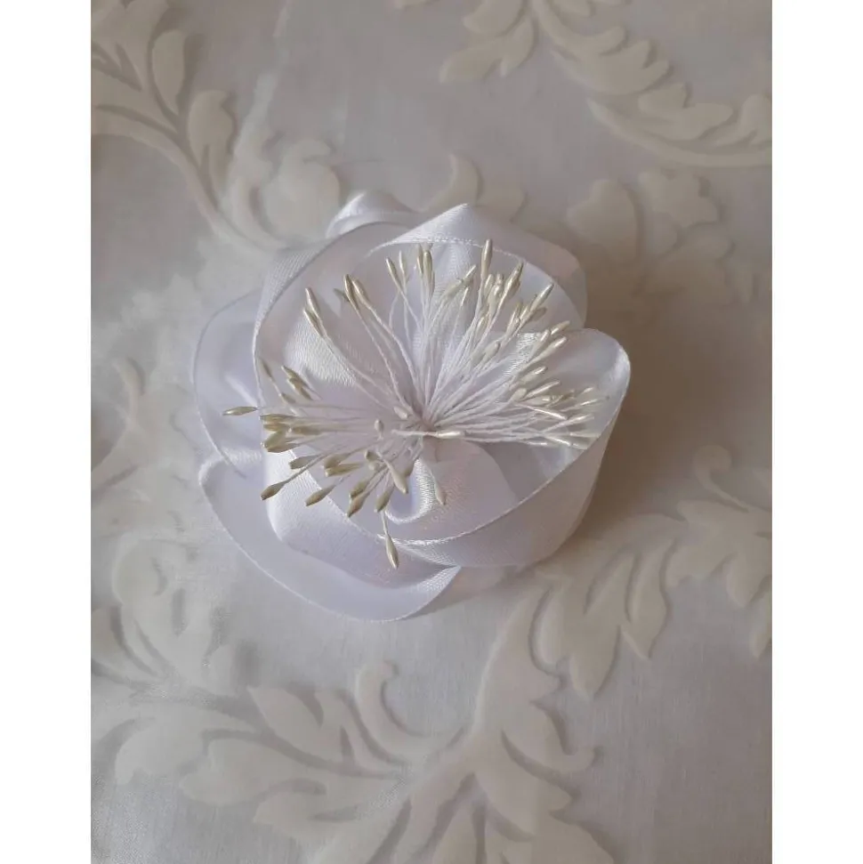 Wunderhübsche Haarklammer in Form einer Blüte, individuell gefertigt aus reinweißem Satin. In der Mitte künstliche Blütenstempel in zartem Hellgelb. Der Durchmesser der Stoffblume beträgt ca. 8 cm.
