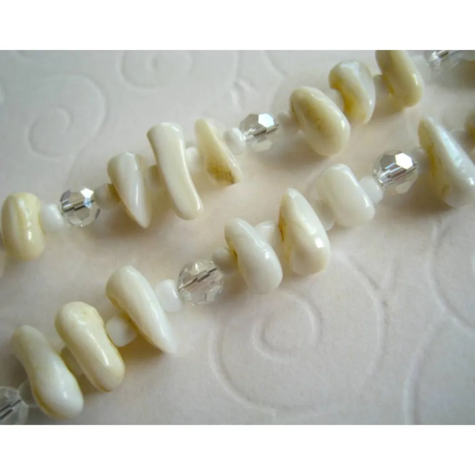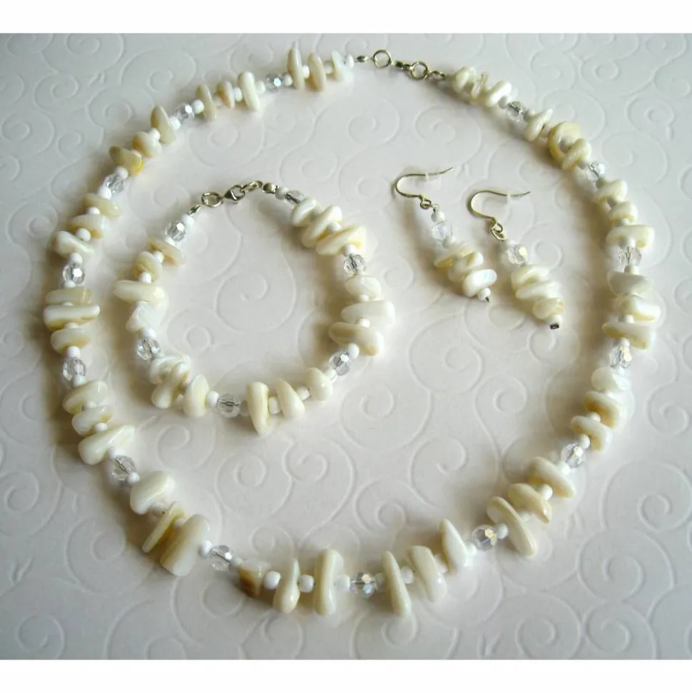 Diesen ungewöhnlichen Brautschmuck – bestehend aus kurzer Halskette, Armband und Ohrhängern – habe ich aus weich abgerundeten, cremefarbenen Muschelperlen, transparenten 6 mm Glasschliffperlen und großen weißen Rocailles zusammengestellt – perfekte Harmonie für Deinen schönsten Tag!