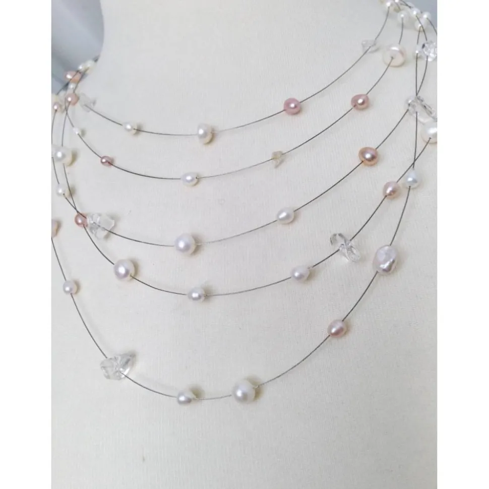Die Perlenkette aus Süsswasserperlen und Halbedelsteinen hat ein Schloß aus Sterling Silber. Die Länge der einzelnen Stränge ist zwischen 43 und 52 cm, das Verlängerungskettchen am Schloss ermöglicht indiviuelles Anpassen.