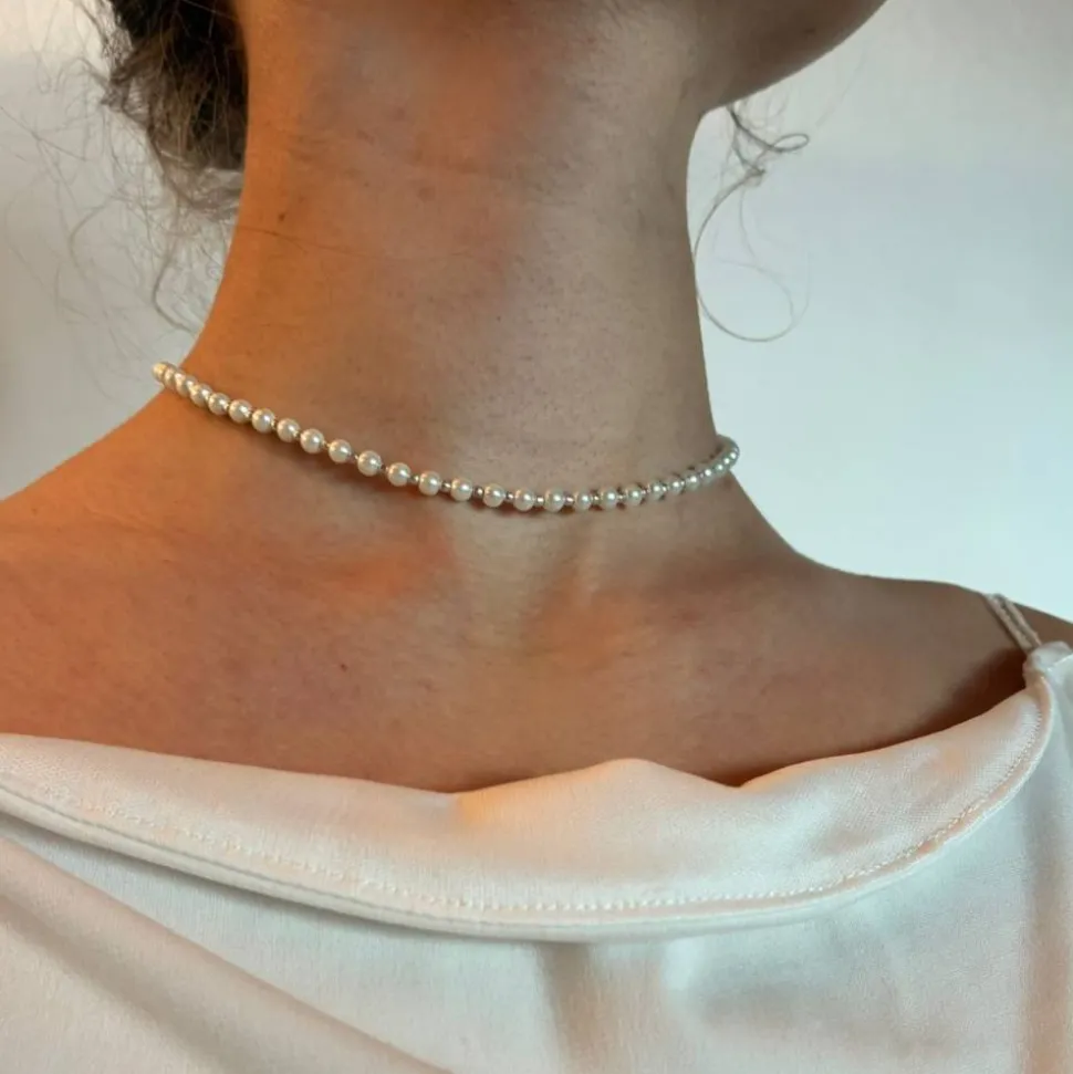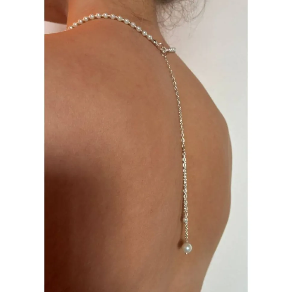 Entdecke das exklusive Brautschmuck-Set, bestehend aus Rückenkette, Armband und Ohrringen – liebevoll gefertigt aus schneeweißen Glaswachsperlen und einer feinen, versilberten Gliederkette mit eleganter Textur.