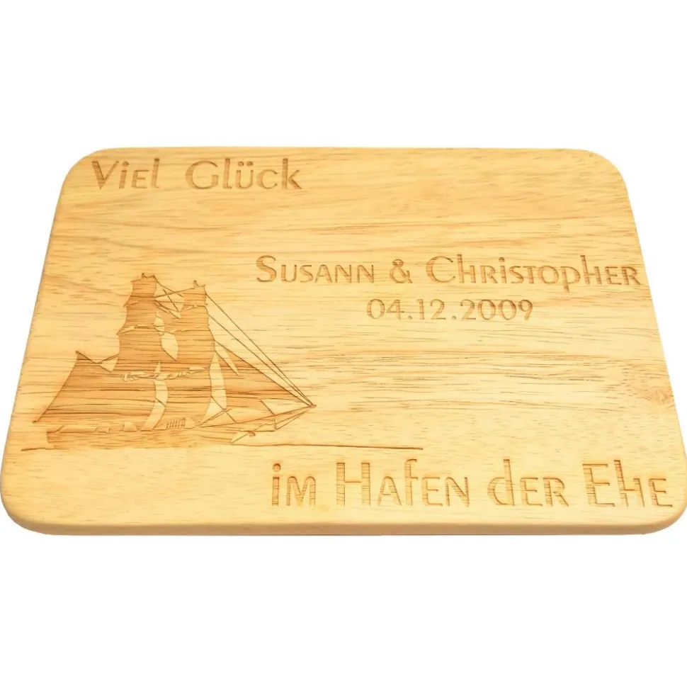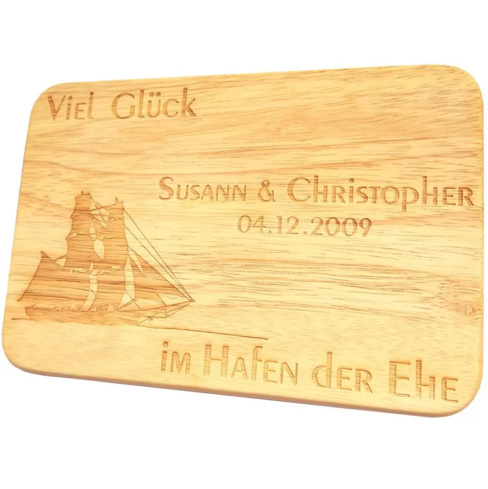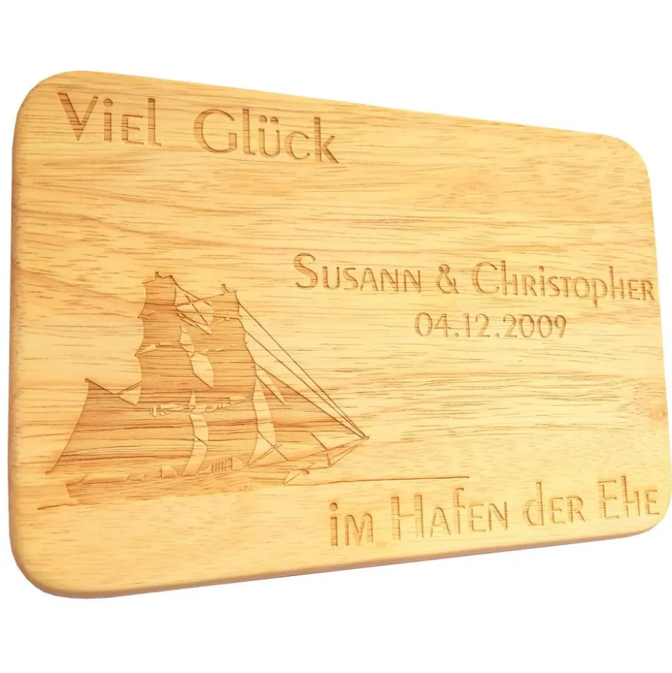 Statt des Spruches „Viel Glück im Hafen der Ehe“ gravieren wir Ihnen auf Wunsch gegen Aufpreis auch einen anderen Text (nur in entsprechend passender Textlänge!) zum Segelschiff auf das Frühstücksbrettchen. Bei Sonderwünschen kontaktieren Sie uns bitte VOR dem Kauf!