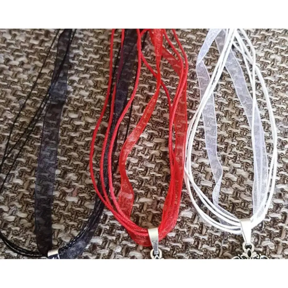 Wahlweise mit schwarzer schlichter oder schwarzer Organza oder roter oder weißer oder Edelstahl Kette, alle zwischen 42-47cm lang, mit Verlängerungskettchen