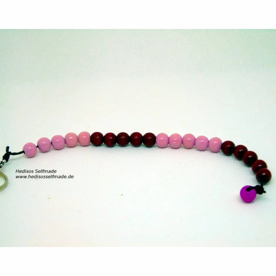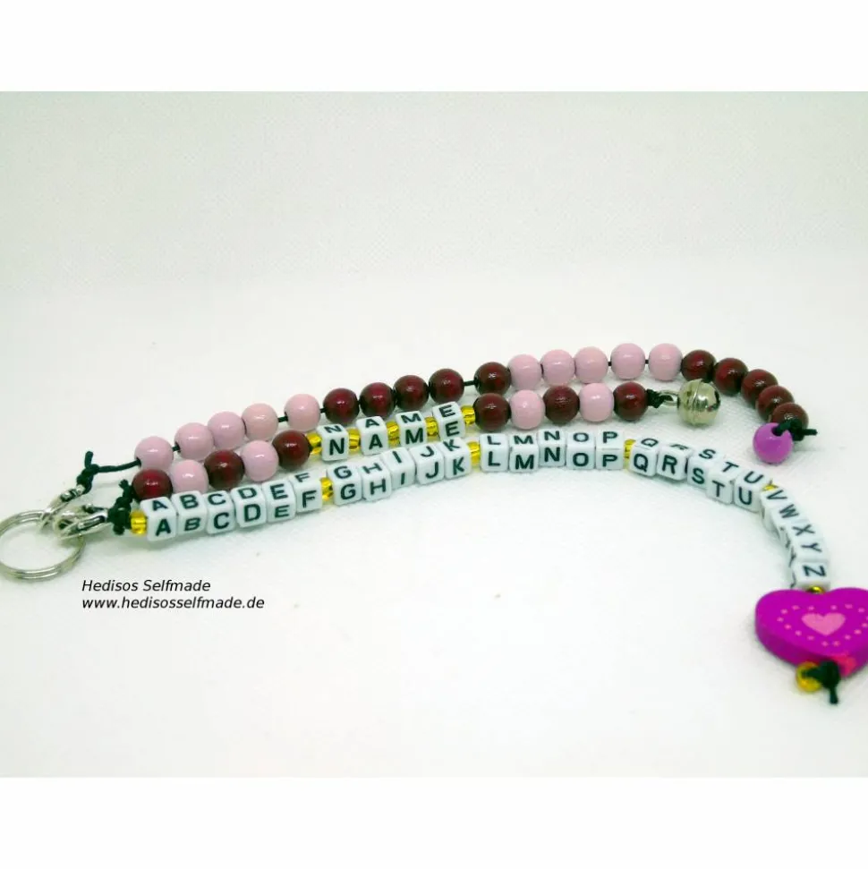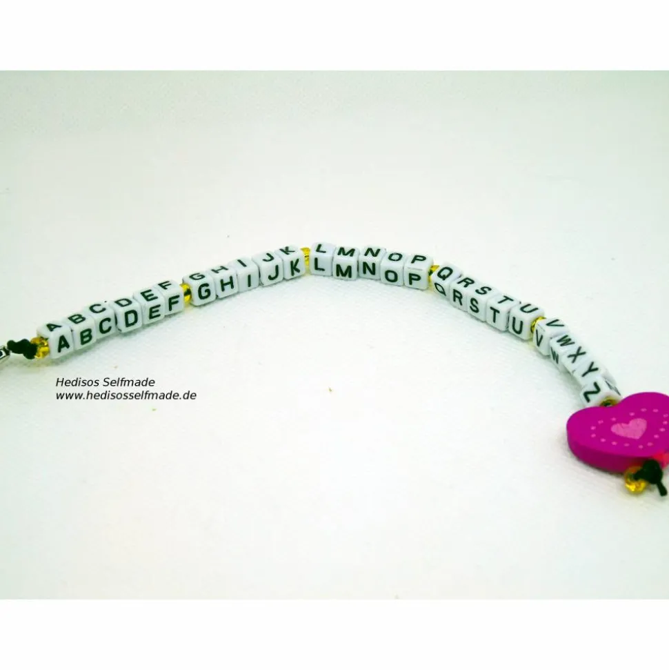 Diese Buchstabenkette macht das Lernen vom ersten Tag an schöner und leichter. Die Buchstabenkette mit dem kompletten Alphabet hilft beim Lernen der Buchstaben. Hier kann das Kind auch jedem zeigen, welche Buchstaben es nun schon kennt. Eine weitere Kette kann man zum Rechnen bis 20 hinzuziehen. Holzperlen in zwei Farben sind hier in Fünfergruppen angeordnet, die beim Rechnen lernen eine gute Hilfe sein können. Den Abschluss bildet noch eine Kette mit dem Namen des Kindes. Alle drei Ketten sind durch Karabinerhaken an einem Schlüsselring befestigt, was es auch möglich macht, jede Kette beliebig von dem Schlüsselring zu entfernen und separat zu verwenden.
