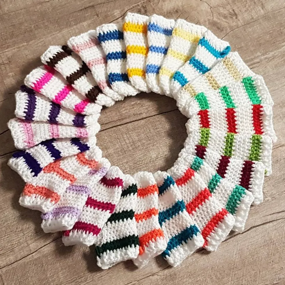 24 kleine gehäkelte Söckchen in verschiedenen bunten Farben und weiß zum Aufhängen.