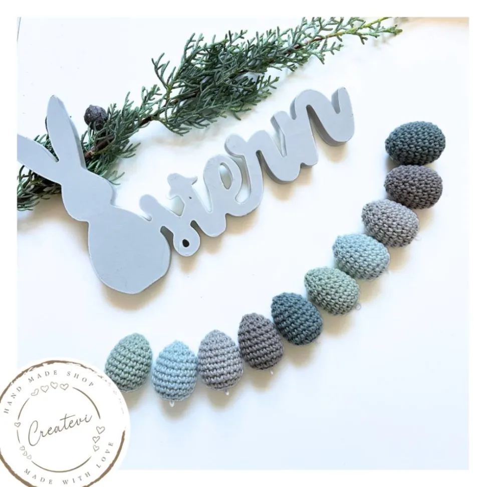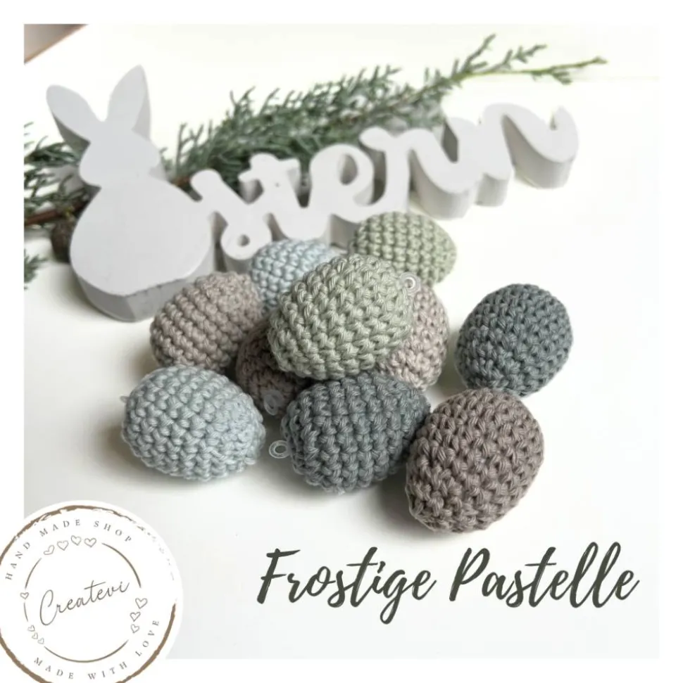 Die Farbkombination „Frostige Pastelle“ verleiht deiner Osterdekoration eine elegante Zurückhaltung. Die Töne Hellgrau, Perlgrau, Eisgrün, Patina und Mint sind jeweils zweimal im Set enthalten und wirken harmonisch aufeinander abgestimmt. Inspiriert von Tautropfen, sanftem Morgenlicht und frischer Frühlingsluft fügen sich diese Farben besonders gut in schlichte und moderne Wohnstile ein. Die gehäkelten Ostereier wirken dekorativ, ohne aufdringlich zu sein, und lassen sich vielseitig kombinieren.