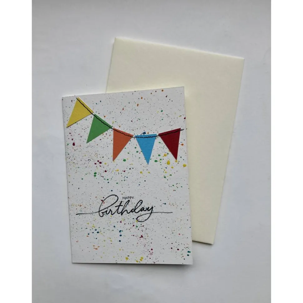 Diese handgemachte Glückwunschkarte besticht durch ihre Liebe zum Detail und wird in Kleinserie gefertigt. Das Highlight der Karte ist eine aufgenähte, bunte Wimpelkette aus Papier – die Farbreihenfolge kann abweichen und macht jede Karte zum Unikat.