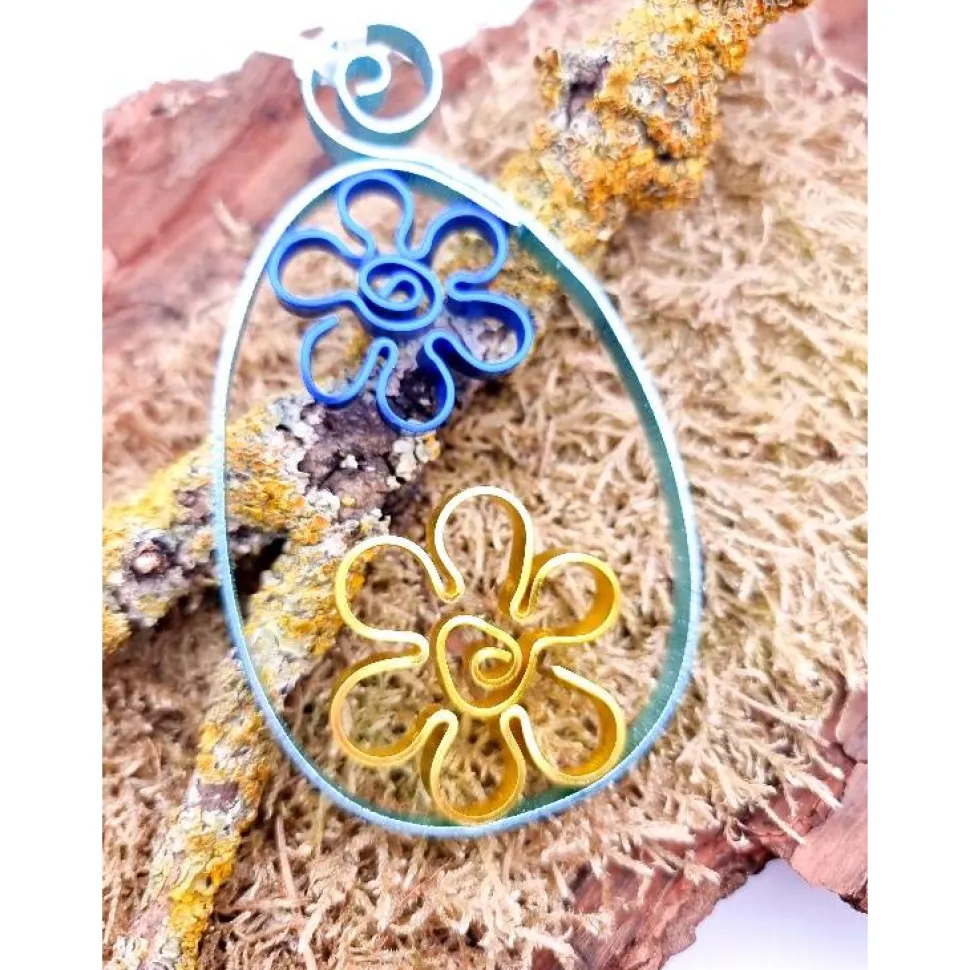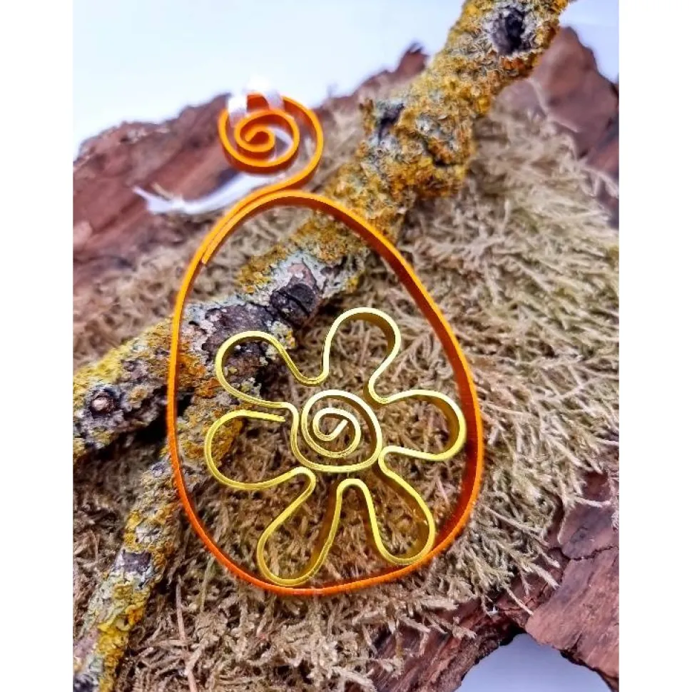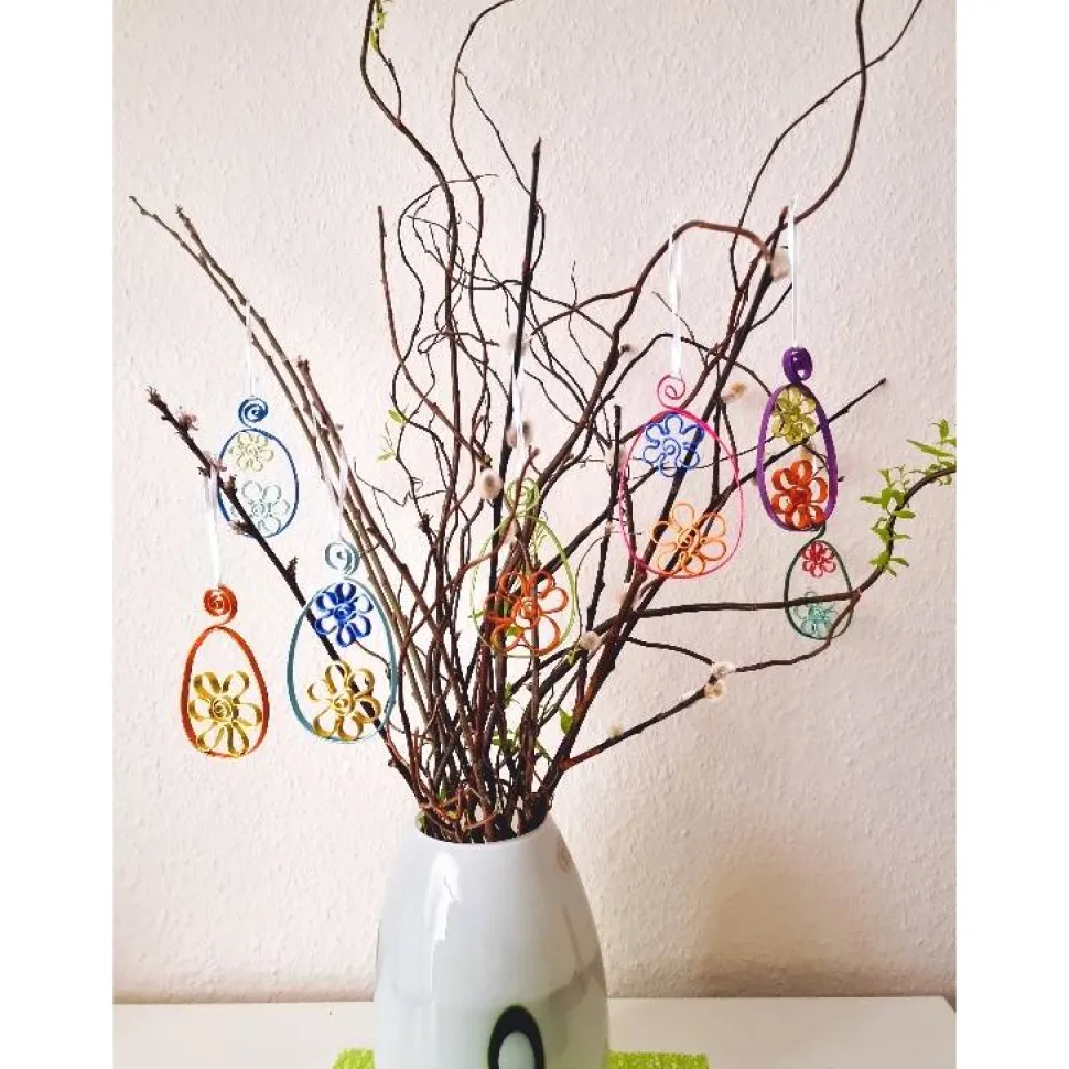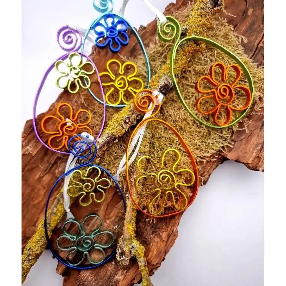 Zwei farbenfrohe Osterei-Anhänger aus flachem Aludraht, die deinem Osterstrauß – drinnen wie draußen – das gewisse Etwas verleihen. Jedes Ei wird von Hand gefertigt und ist ein kleines Unikat für alle, die liebevolle Handarbeit zu schätzen wissen. Am weißen Satinbändchen aufgehängt, schwingen sie leicht im Frühlingswind und setzen auch im Garten einen besonderen Akzent.