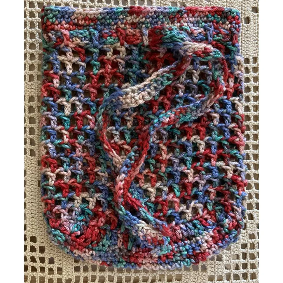 Das Häkelnetz ist mit einem festen Boden aus festen Maschen und halben Stäbchen gehäkelt. Der obere Rand besteht aus festen Maschen, während die Füllfläche mit einem Stäbchen-Lochmuster gehäkelt ist. Am oberen Rand befindet sich ein Häkelband als Verschluss aus dem gleichen, bunten Baumwollgarn.