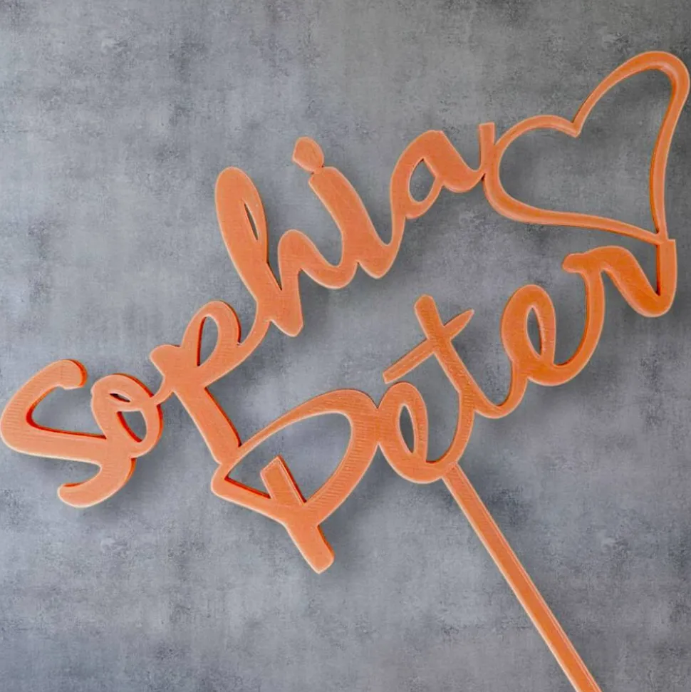 Der Cake Topper besteht aus zwei frei wählbaren Vornamen,die durch ein stilvolles Herz verbunden sind – ideal für romantische Hochzeits-und Verlobungstorten. Geben Sie bei der Bestellung die Namen an und wählen SieIhre Wunschfarbe.