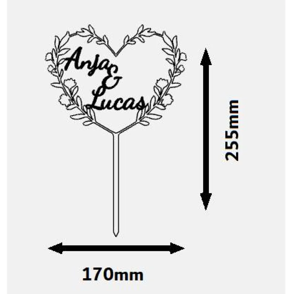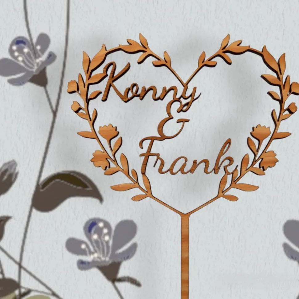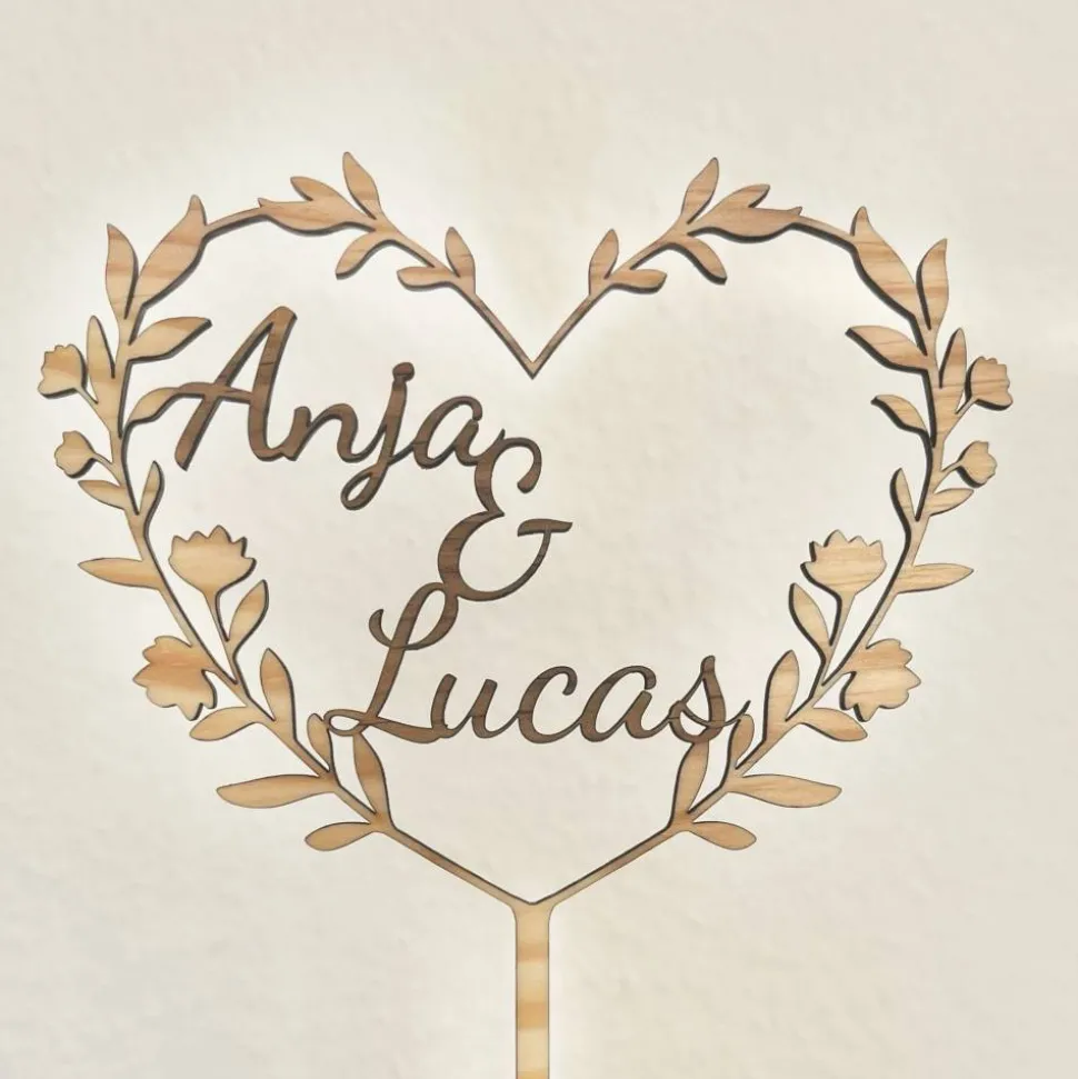 Die Integration Ihrer Namen in die Herzform verleiht dem Cake Topper eine persönliche und einzigartige Note. Dieser Herz-Cake-Topper passt perfekt zu einer Vielzahl von Hochzeitsstilen, von klassisch bis modern, und verleiht Ihrer Torte einen Hauch von natürlicher Schönheit.