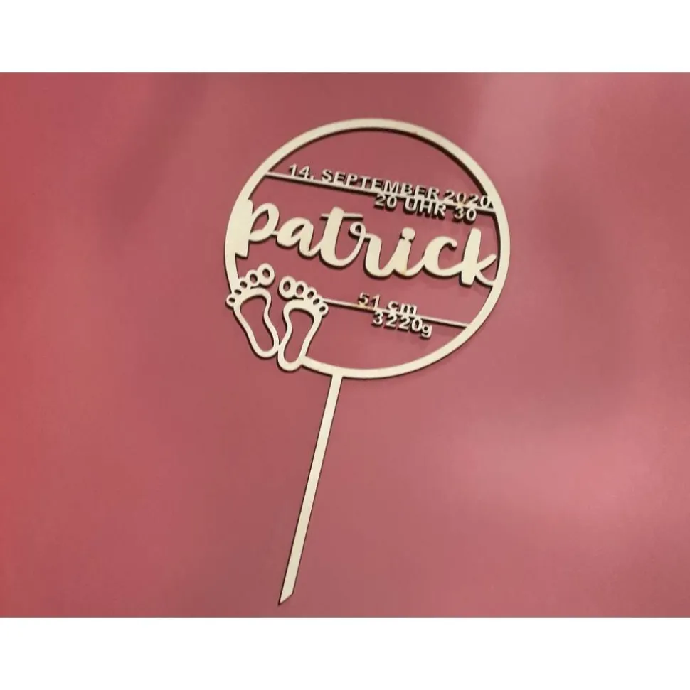 Der Caketopper, der sich auch nach der Torte noch gut als Dekoobjekt macht. Personalisiert mit Name und Geburtsdaten des Kindes.