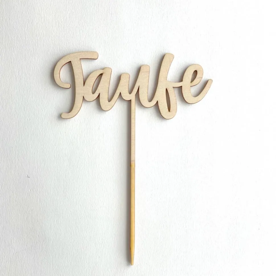 Dieser Holz-Caketopper mit dem Schriftzug „Taufe“ ist das Highlight für deine Torte.