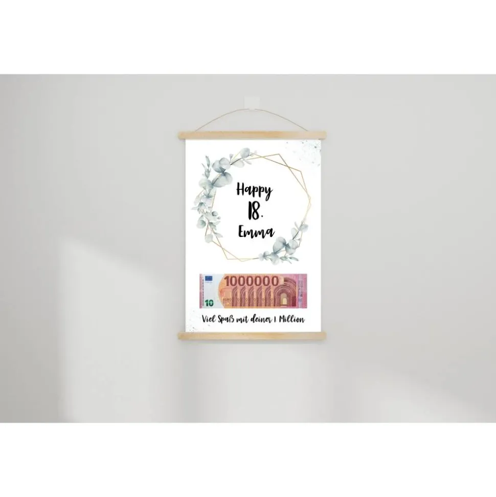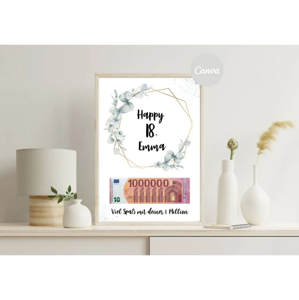 Du suchst nach einem hübschen persönlichem Geldgeschenk zum 18. Geburtstag deiner Freundin, deiner Tochter oder einer Kollegin? Mit diesem Download ist das Geschenk innerhalb weniger Minuten fertig. Nachdem du das Poster ausgedruckt hast, schneidest du am besten mit einem Cutter die Zahlen aus und hinterlegst dort die Geldscheine.