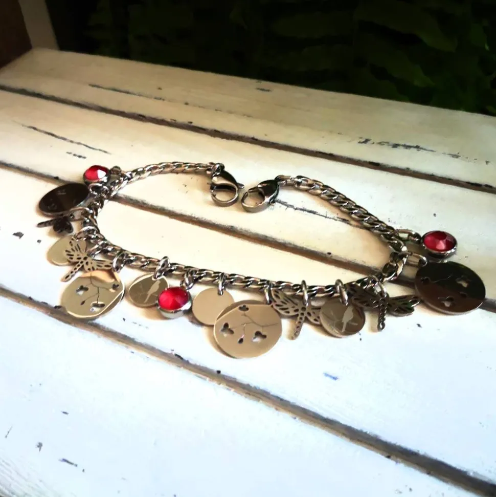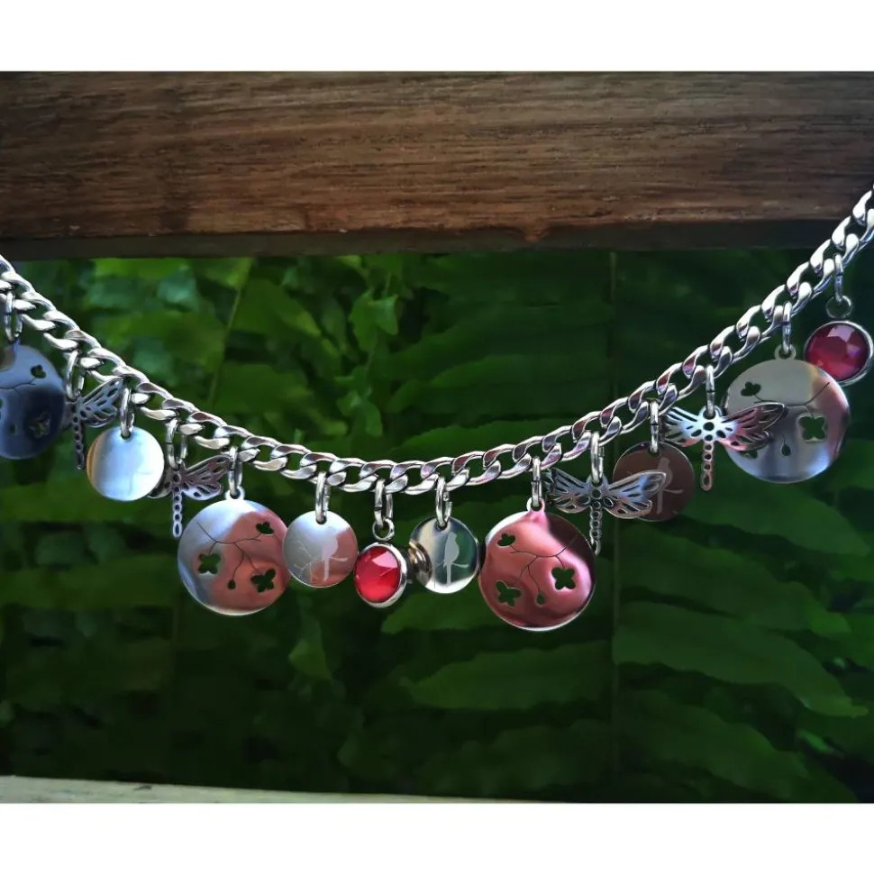 Dieses Charivari wurde aus einer massiven Kette,Edelstahlanhängern und in eingefassten geschliffenen Glassteinen gefertigt.