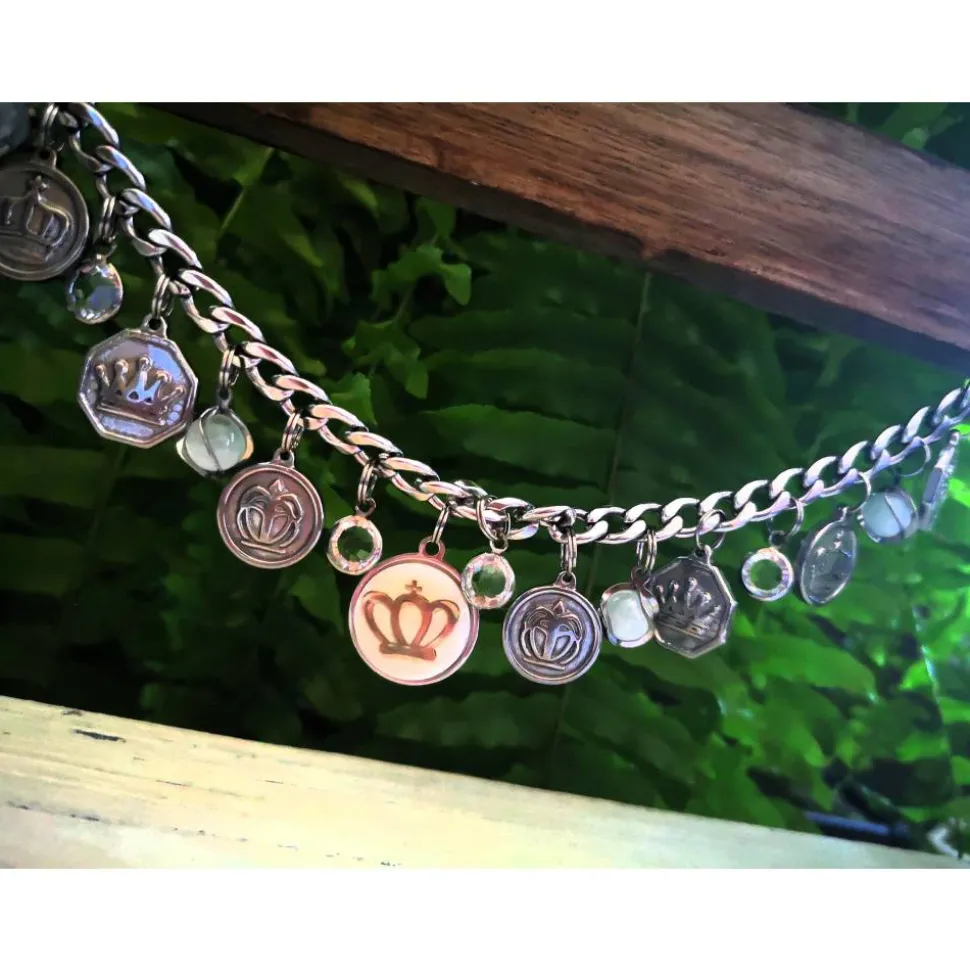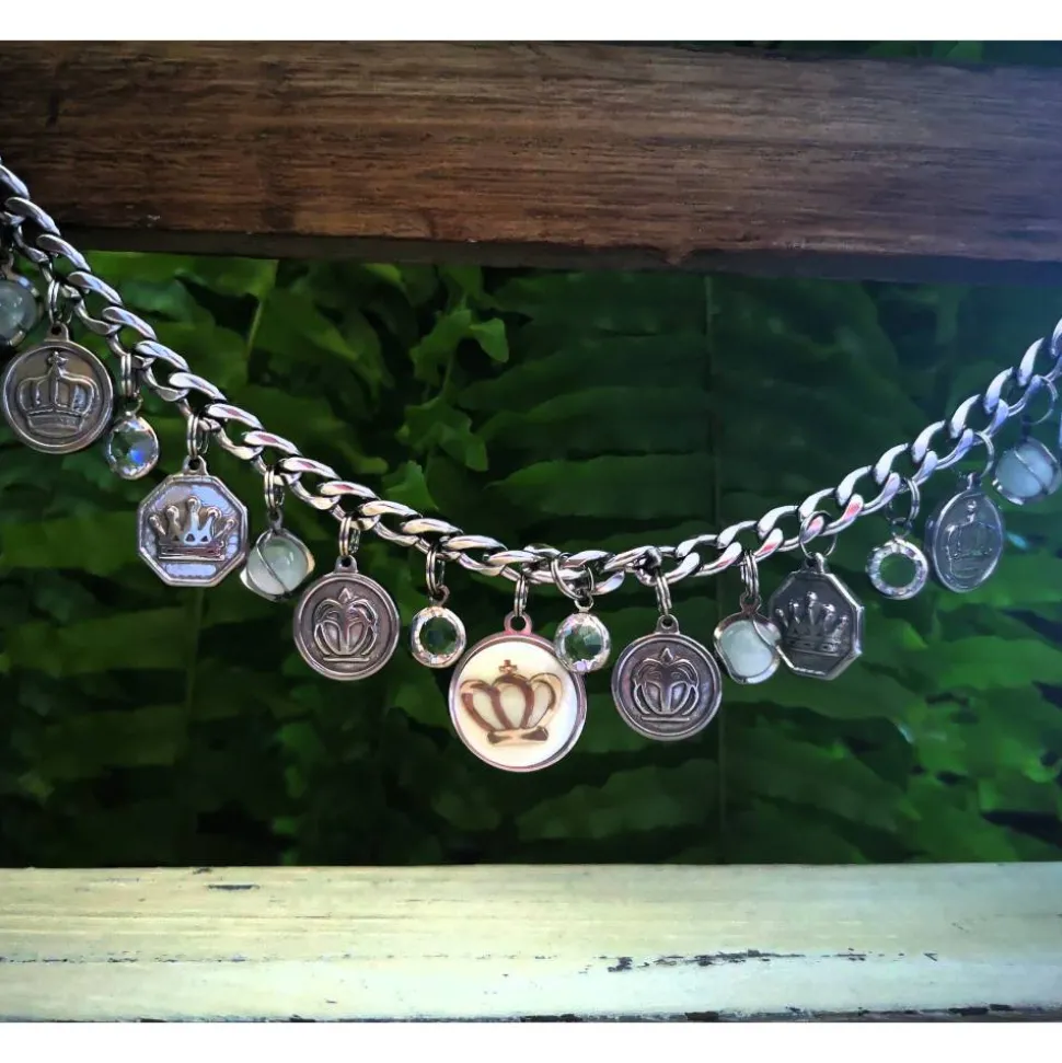 Dieses Charivari wurde aus einer massiven Kette,massiven (königlichen) Edelstahlanhänger, eingefassten Glassteinen und weissen Cateyeperlen im Käfig gefertigt.