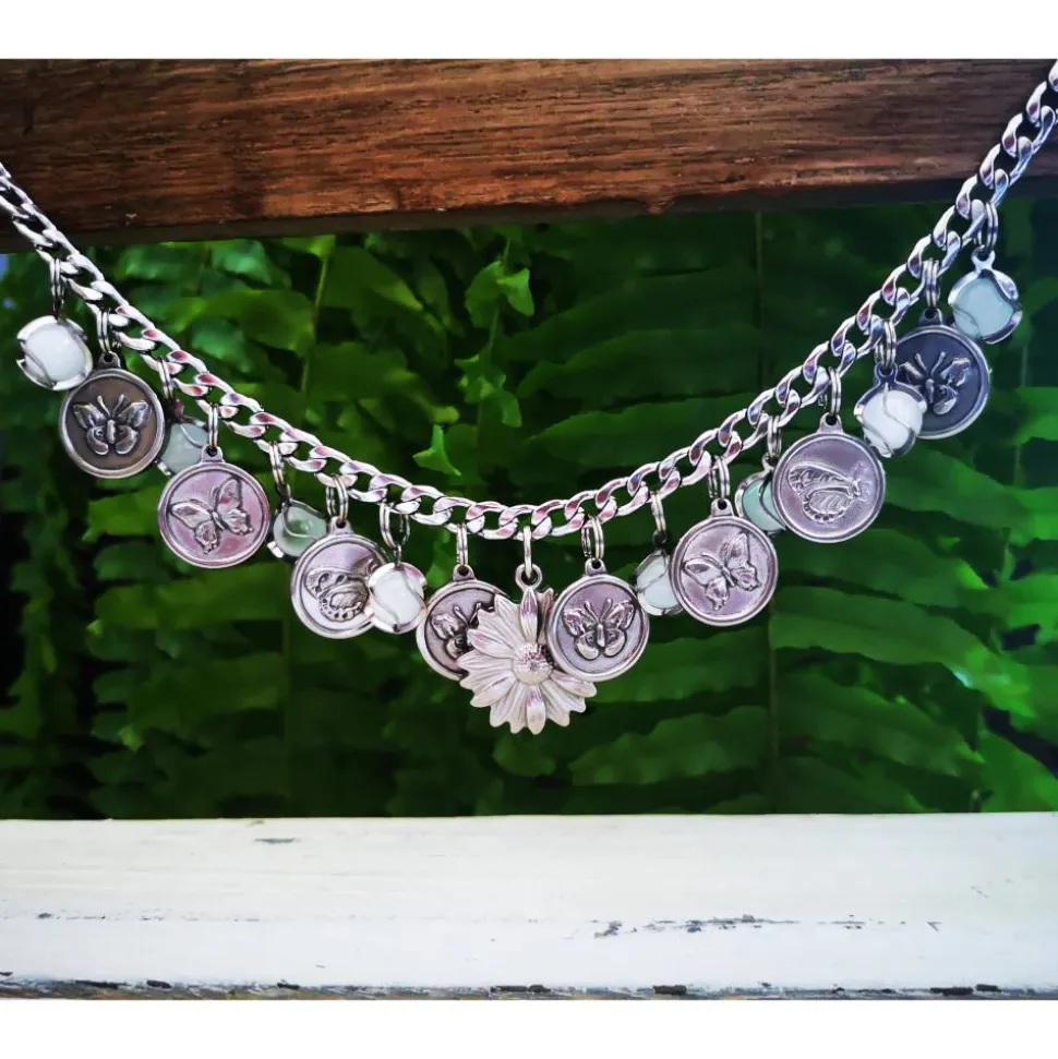 Dieses Charivari wurde aus einer massiven Kette,massiven Edelstahlanhängern (verschiedene Schmetterlingsmotive) und weissen Cateyeperlen im Käfig gefertigt.