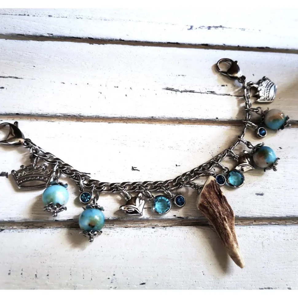 An einer massiven Edelstahlkette wurde ein Horn-Anhänger , kleine Strassanhänger, Jadeperlen und Motivanhänger angebracht, die für einen besonderen Blickfang sorgen.