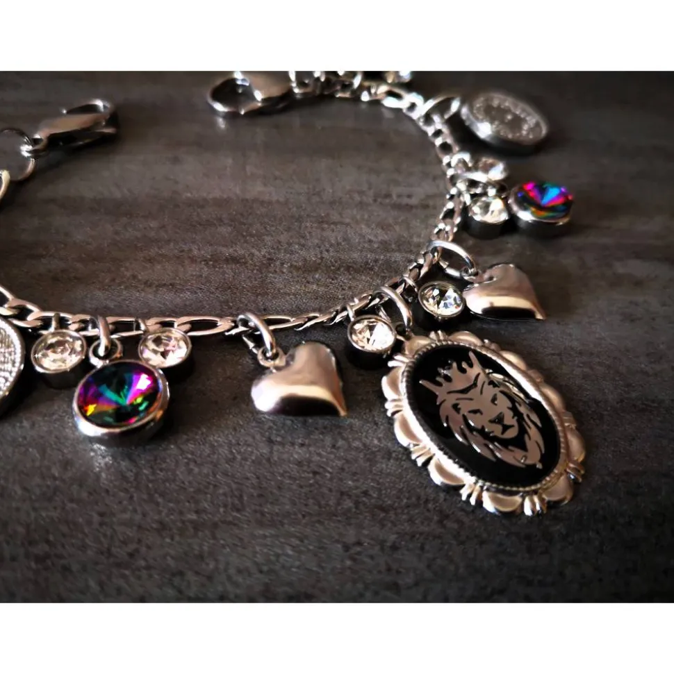 An einer massiven Edelstahlkette wurden glitzernde Strass-, Herz-, Münz- und Löwenanhänger angebracht.