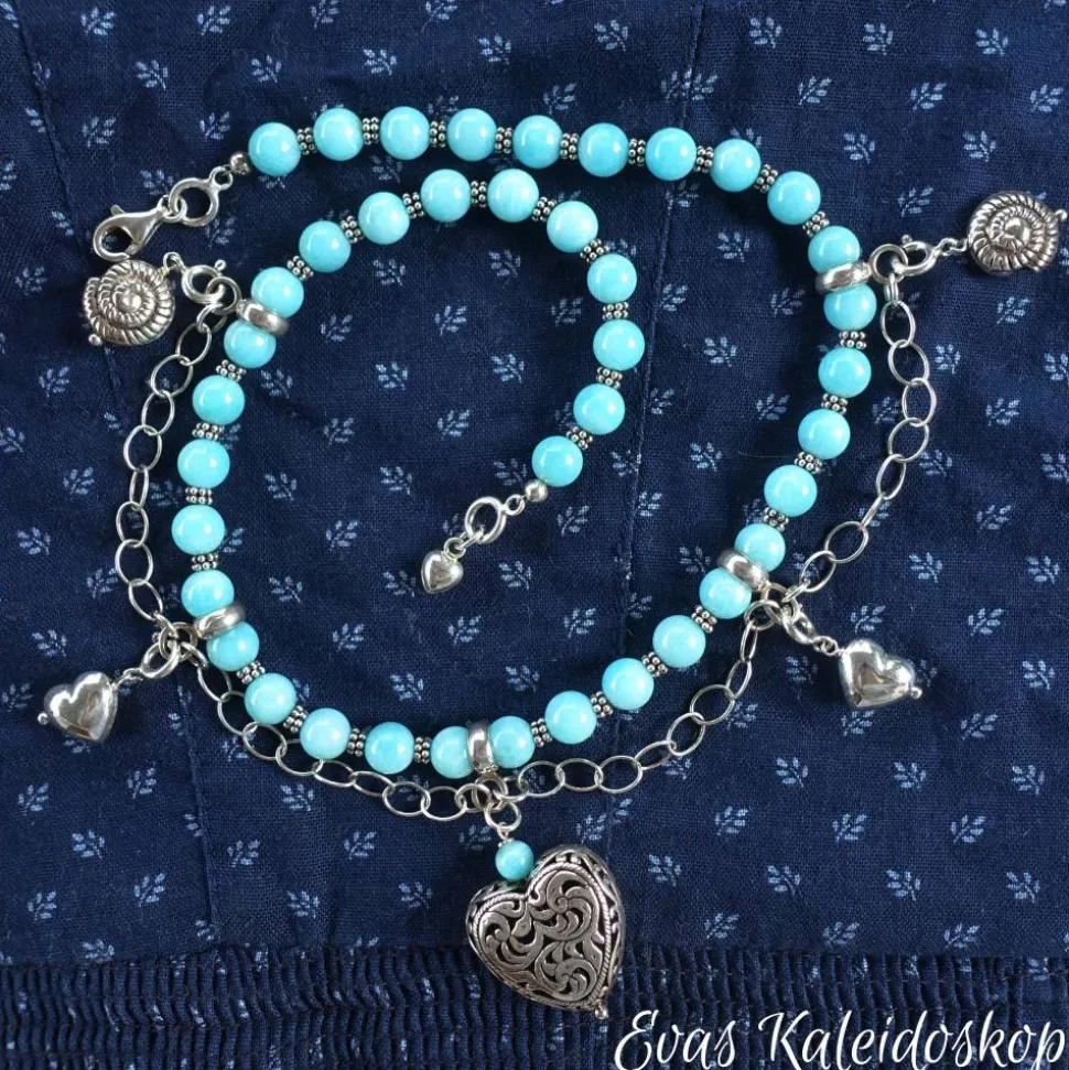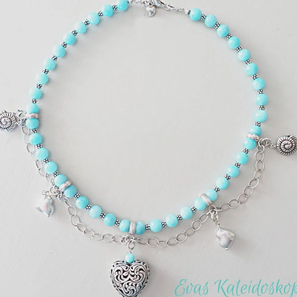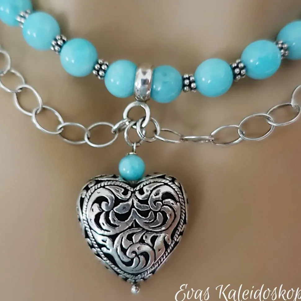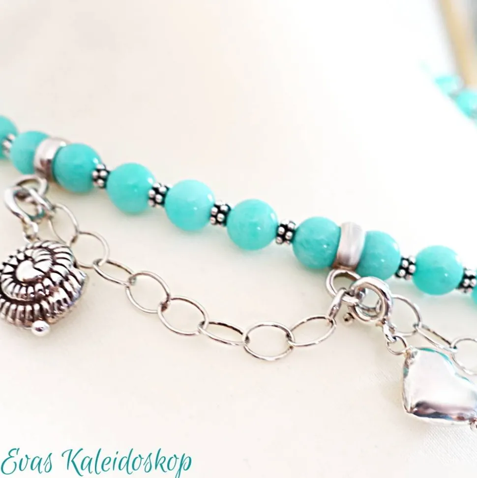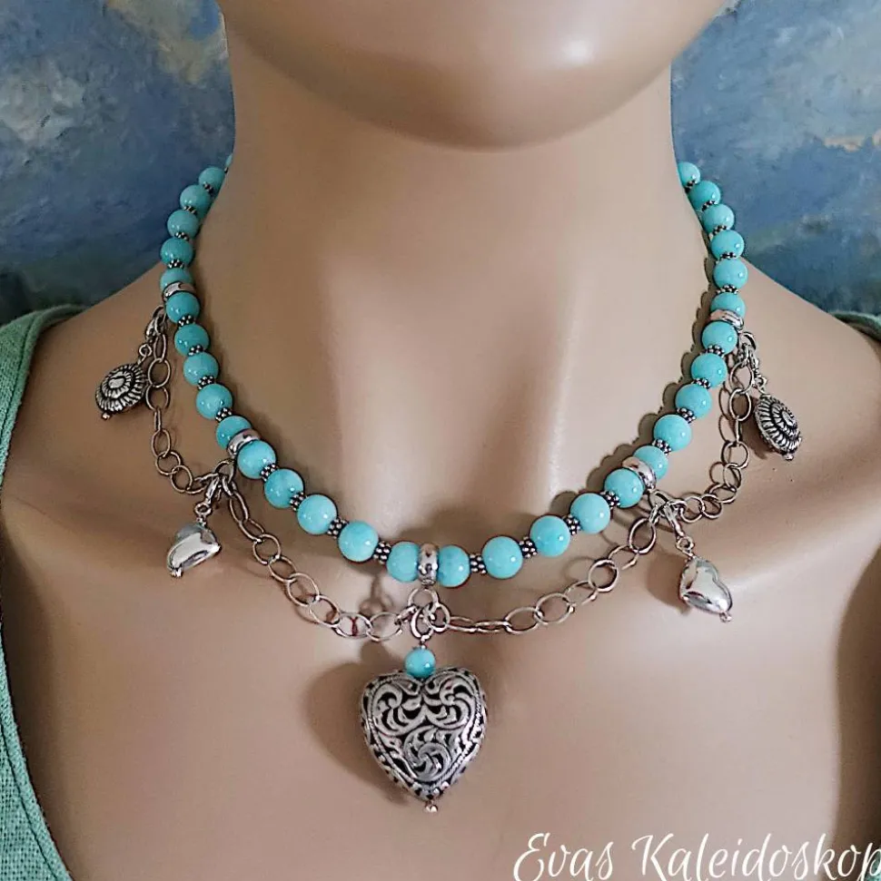 Nicht nur zum Oktoberfest, sondern das ganze Jahr über schmückt die detailreiche Kette den Ausschnitt des Dirndls. Warum sollen nur Männer ein Charivari haben? Die weibliche Variante ist etwas höher gerutscht und lässt sich ebenso nach Belieben ergänzen und verändern. Das große Silberherz ist fest integriert, die Silberschnecken und kleinen Herzen können abgenommen und durch andere Charms ersetzt werden. Silberkettenabschnitte hängen girlandenartig von der Hauptkette, wie beim Charivari. Ein kleines Herz am Verschluss ist ein weiteres Extra. Ein Kugelringpaar ist zwischen jeder einzelnen Amazonitkugel eingefügt.