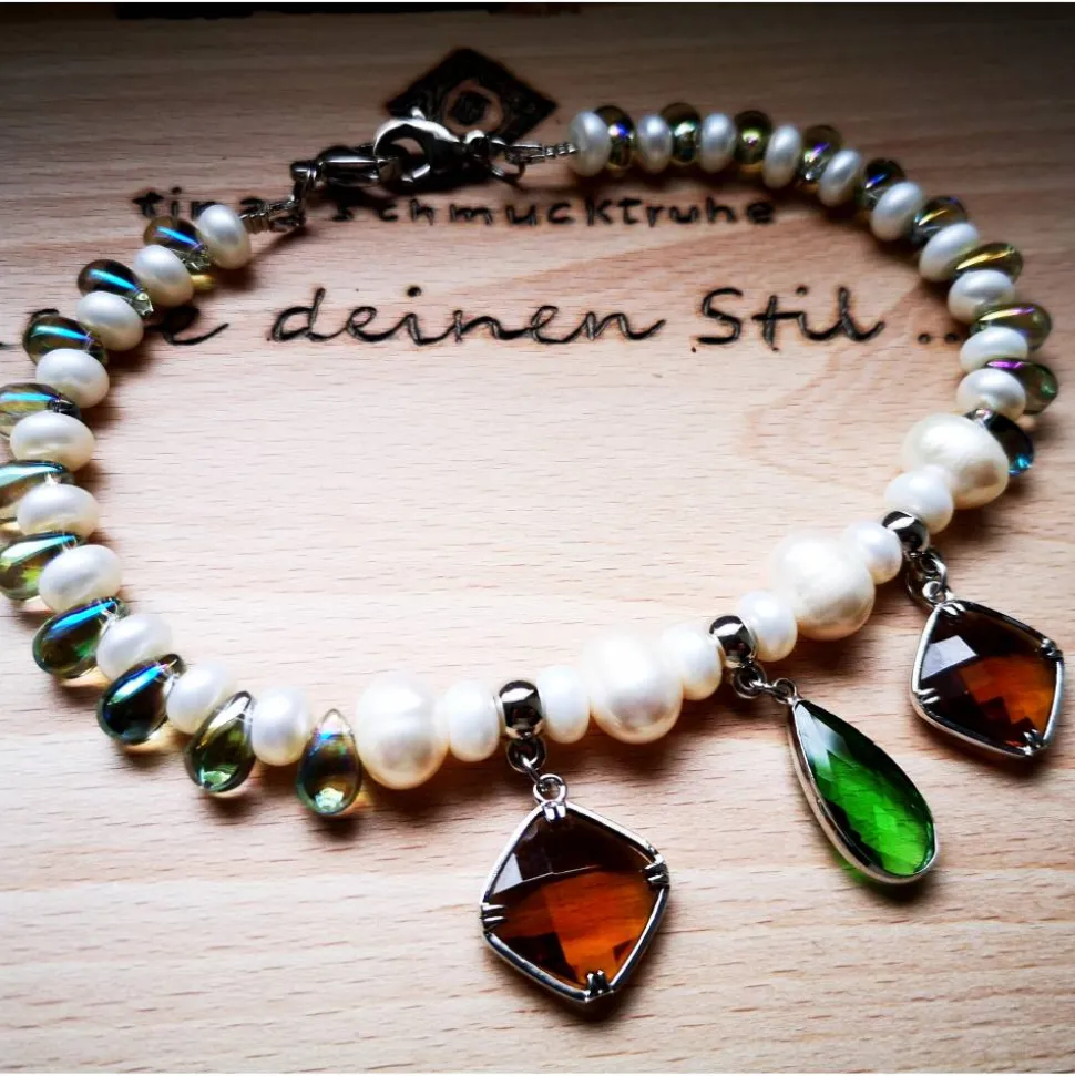 Dieses Charivari wurde aus irisierenden Glastropfen, hellen Zuchtperlen in unterschiedlicher Größe und Anhängern gefertigt.