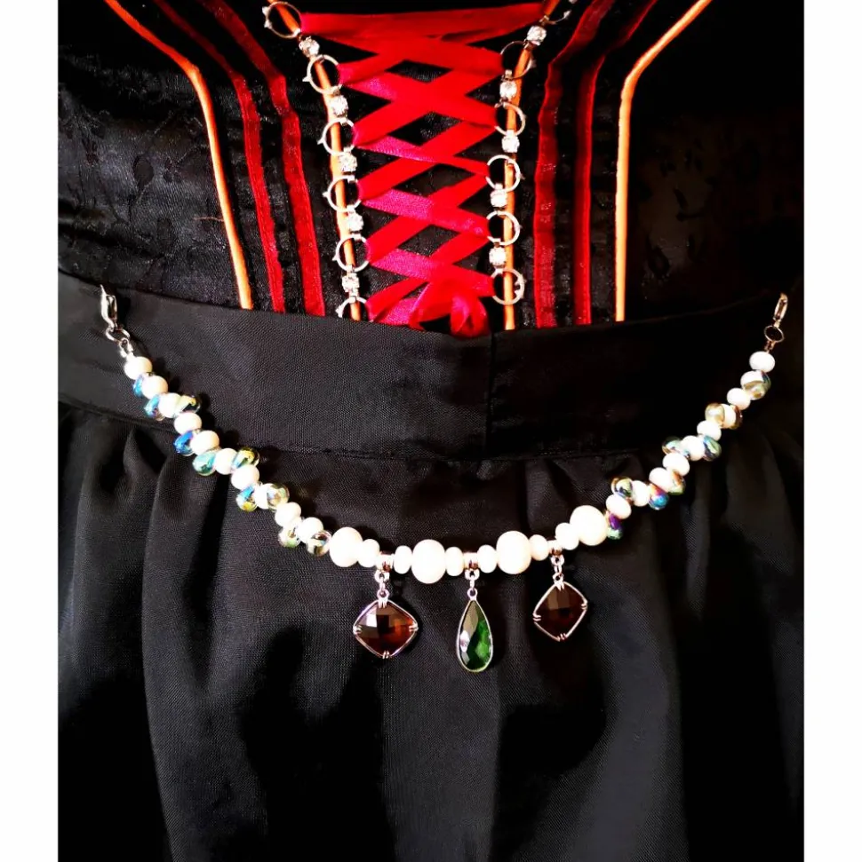 Dieses Charivari kann Schürzen und Mieder (siehe Länge) verzieren. Dank großer, stabiler Edelstahlkarabiner läßt sich das Charivari problemlos einhängen und kann jederzeit gewechselt werden.