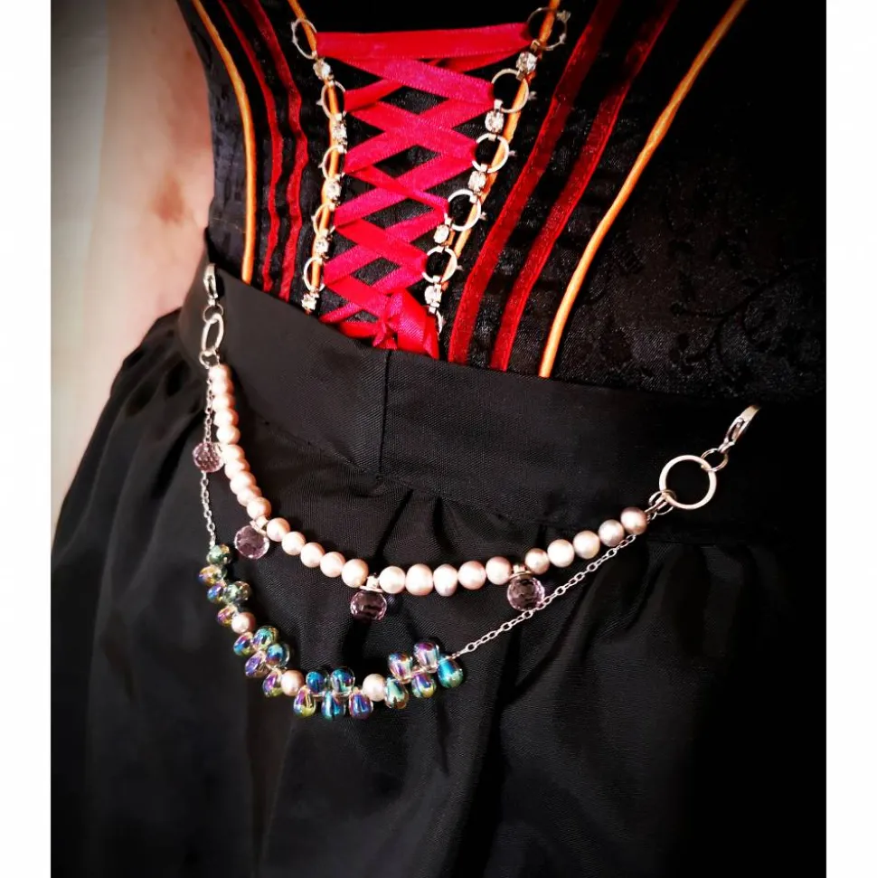 Dieses Charivari kann Schürzen und Mieder (siehe Länge) verzieren. Dank großer, stabiler Edelstahlkarabiner läßt sich das Charivari problemlos einhängen und kann jederzeit gewechselt werden.