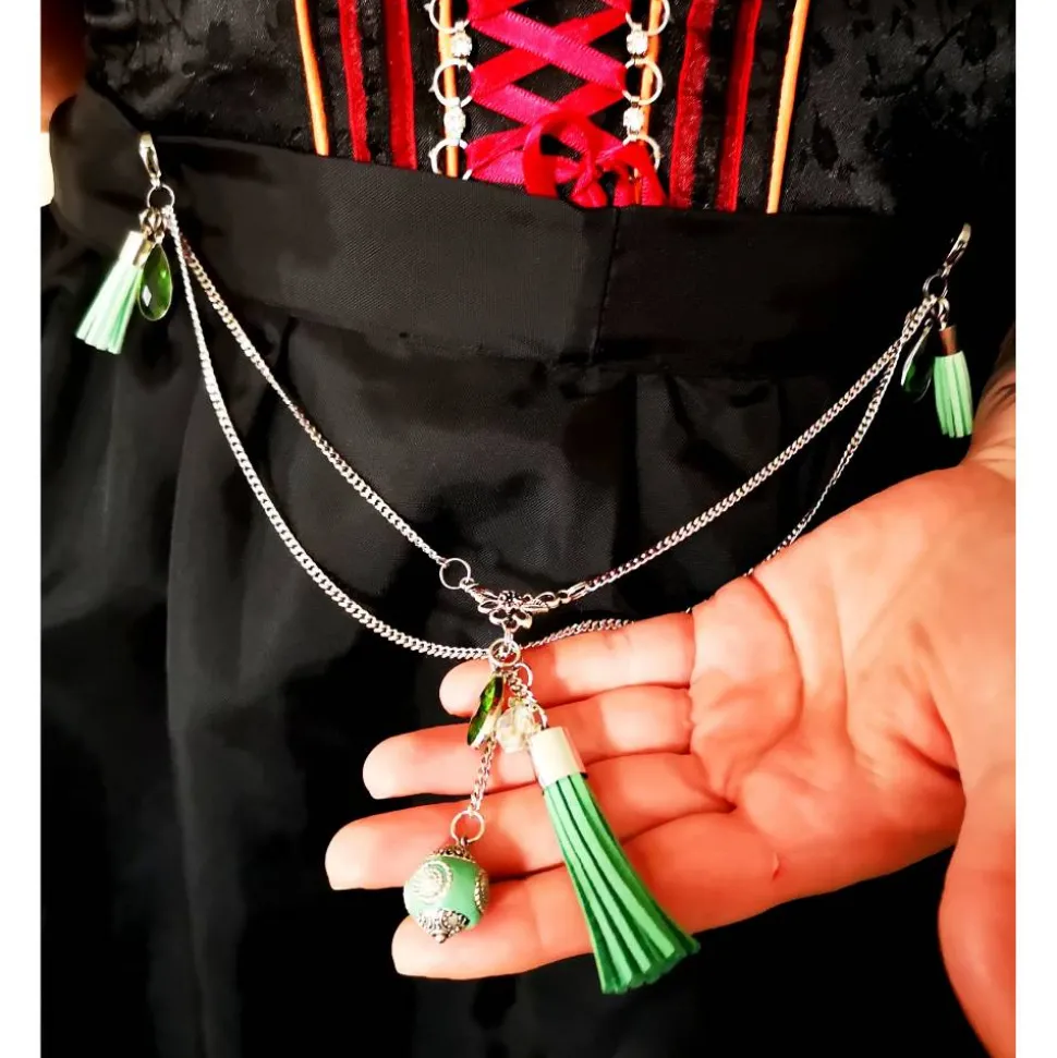 Unsere Charivaris sind meist für Schürzen (siehe Länge) gedacht. Dank großer, stabiler Edelstahlkarabiner läßt sich das Charivari problemlos einhängen und kann jederzeit gewechselt werden.