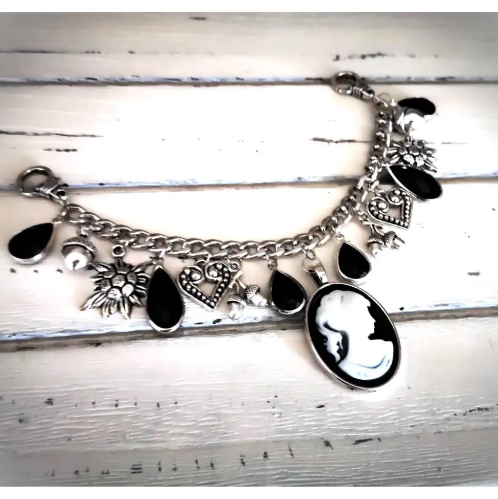 Dieses wunderschöne Charivari in silber-schwarz wurde aus geschliffenen Glastropfen, Cabochon und verschiedenen Metallanhängern gefertigt.