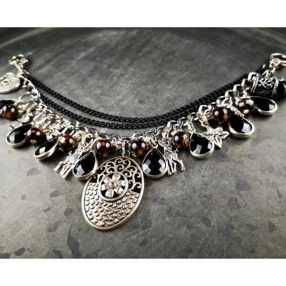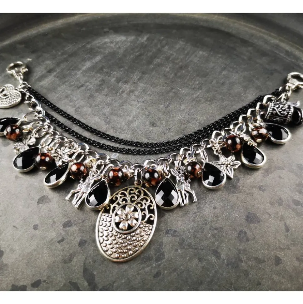 Dieses Charivari kann Schürzen und Mieder (siehe Länge) verzieren. Dank großer, stabiler, verzierter Karabiner läßt sich das Charivari problemlos einhängen und kann jederzeit gewechselt werden.