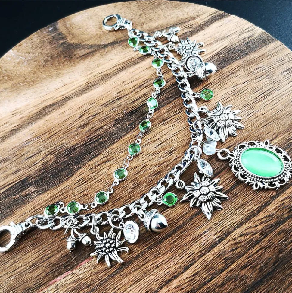 Dieses Charivari kann Schürzen und Mieder (siehe Länge) verzieren. Dank großer, stabiler, verzierter Karabiner läßt sich das Charivari problemlos einhängen und kann jederzeit gewechselt werden.